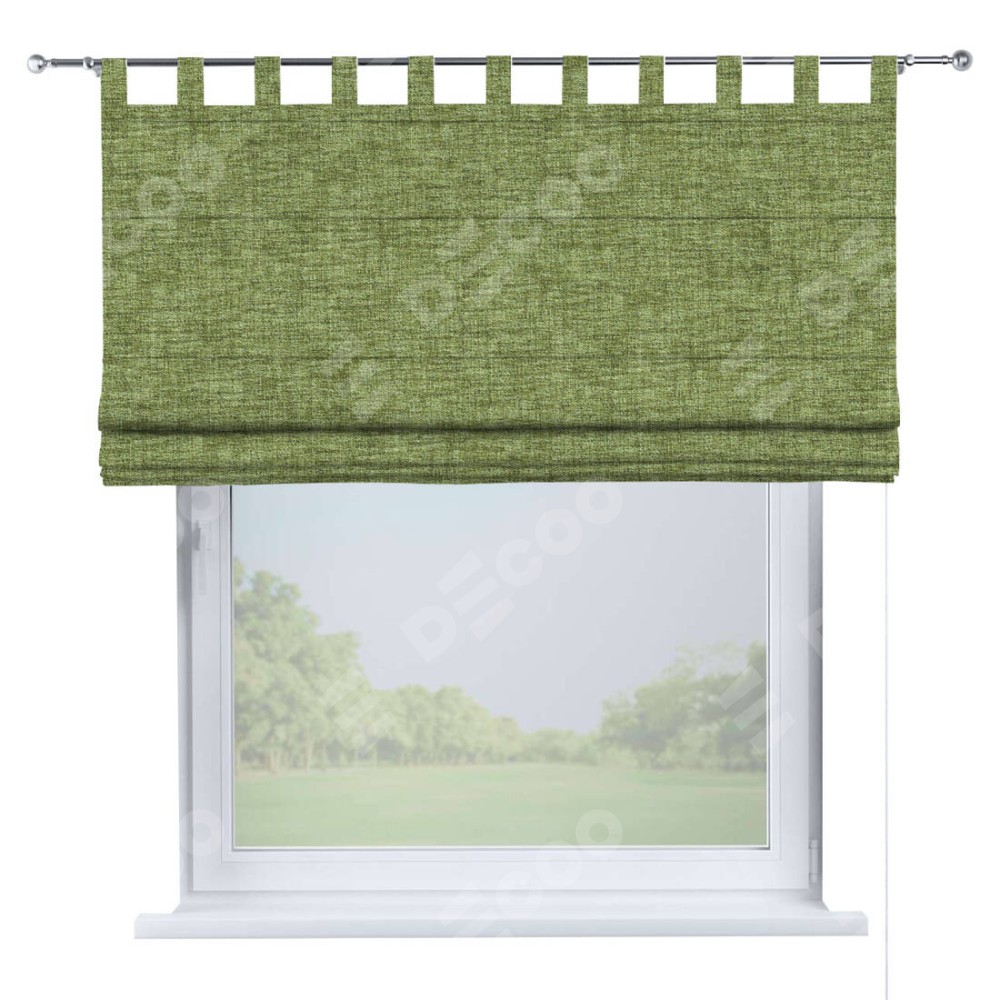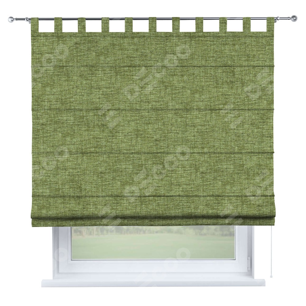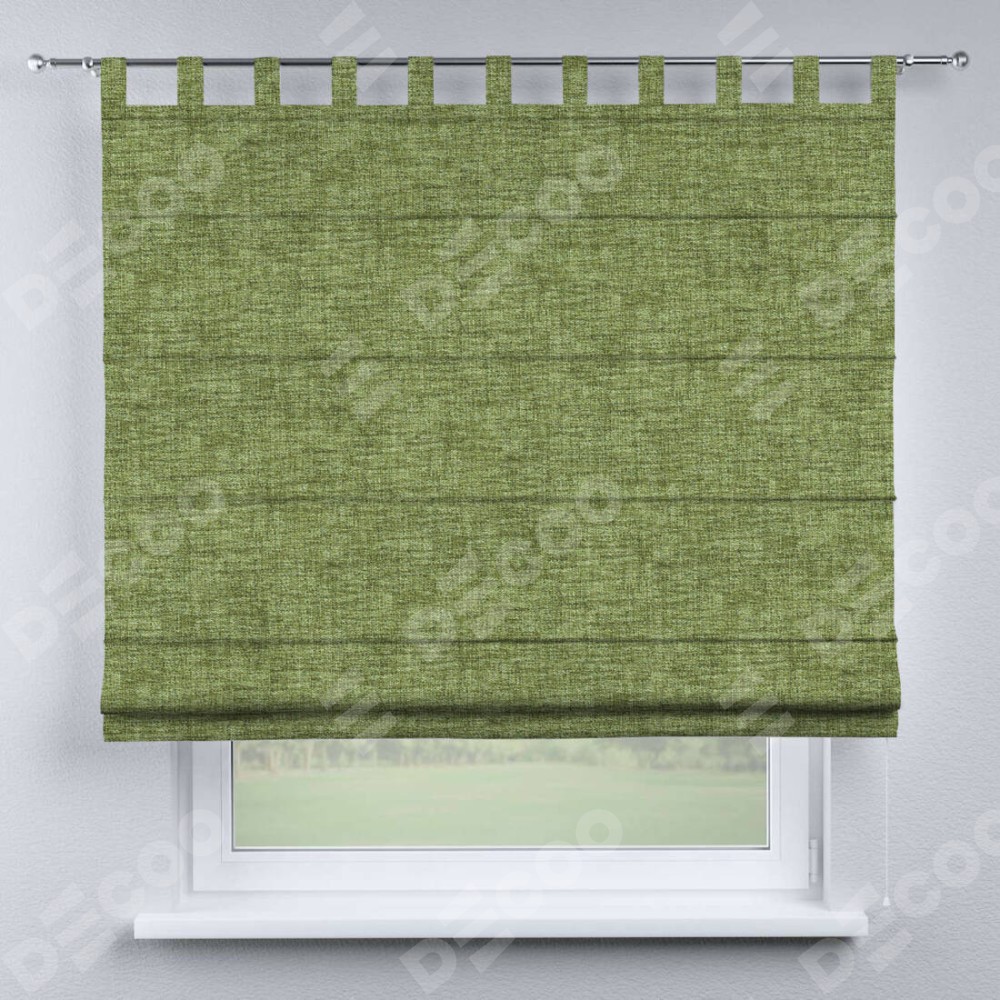 Римская штора производителя «Cortin», используется для проёма, пошита из ткани рогожка димаут травяной, артикул ткани 91021. Данная модель пошита на петлях, комплектуется на выбор круглым карнизом и подходит для монтажа на стену. Римская штора на петлях имеет простую систему регулировки высоты, отличительным преимуществом данной модели является простой способ монтажа. Достаточно повесить ее на трубу и штора готова!