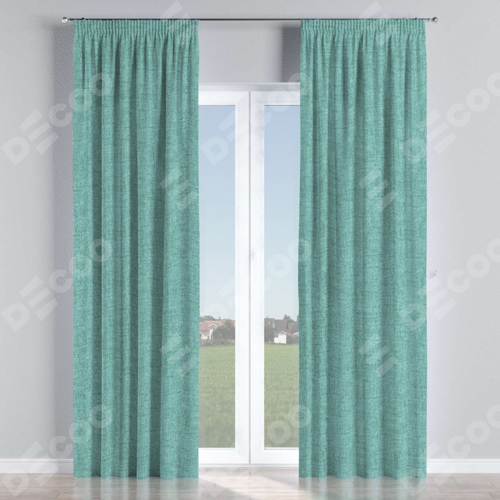Комплект прямых штор, от производителя «Cortin», пошиты из ткани рогожка димаут аквамариновый крайола, артикул ткани 91023. С изнаночной стороны в верхней части штор пристрачивается шторная лента с декоративными складками «Карандаш». Для создания элегантных складок прямые шторы шьются по стандарту с коэффициентом 1:2 (на 100 см. ширины проёма 200 см. ширины ткани).