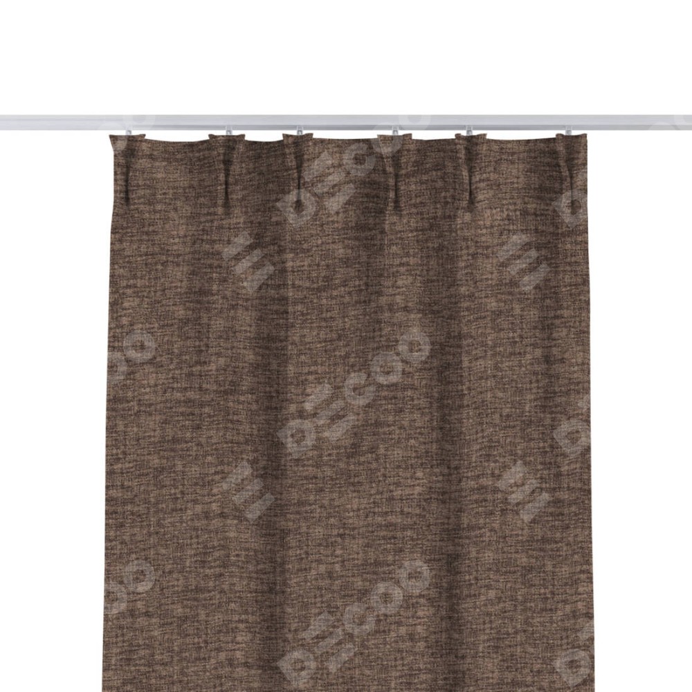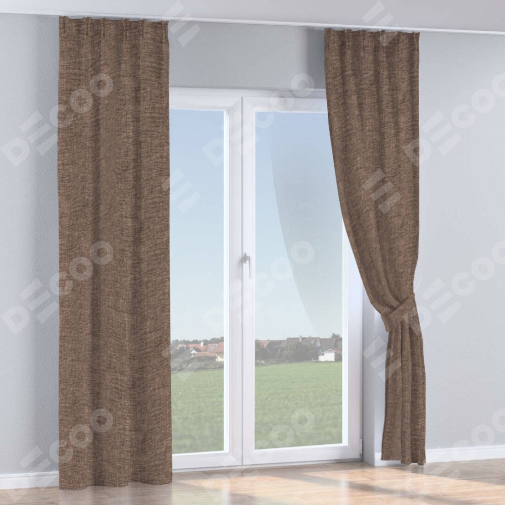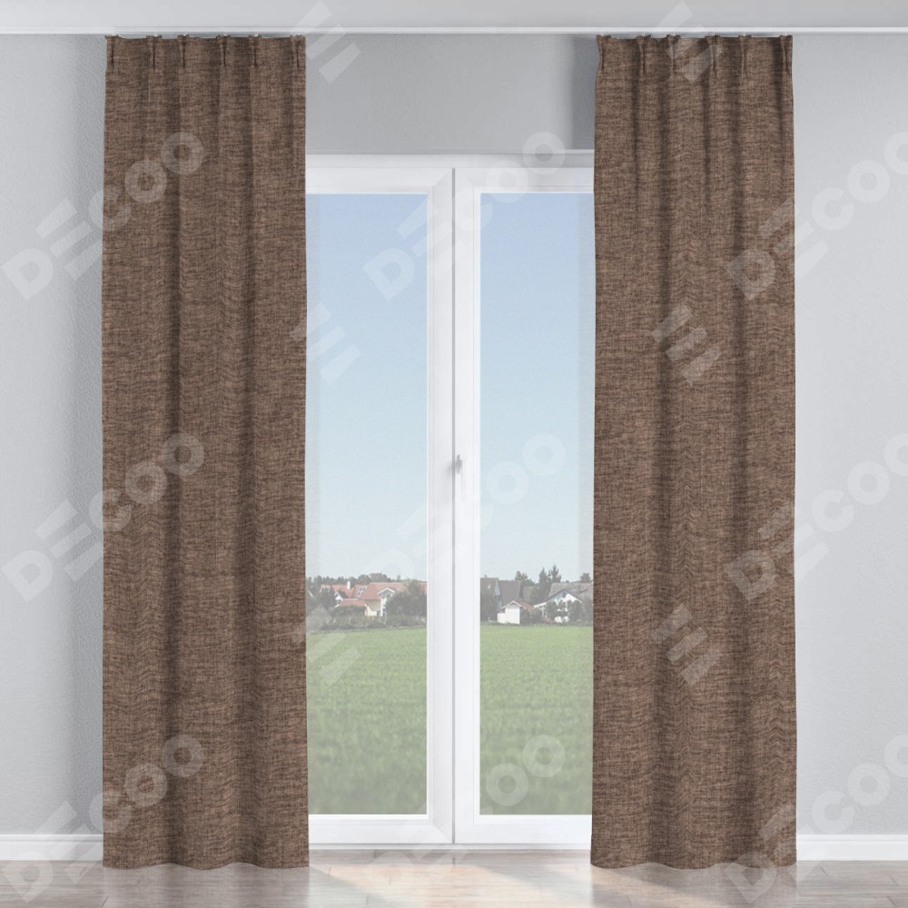 Комплект прямых штор, от производителя «Cortin», пошиты из ткани рогожка димаут коричневый, артикул ткани 91018. С изнаночной стороны в верхней части штор пристрачивается шторная лента с декоративными складками «Кустик». Для создания элегантных складок прямые шторы шьются по стандарту с коэффициентом 1:2 (на 100 см. ширины проёма 200 см. ширины ткани).