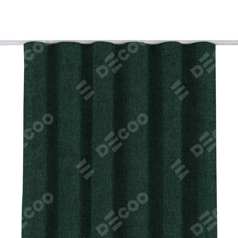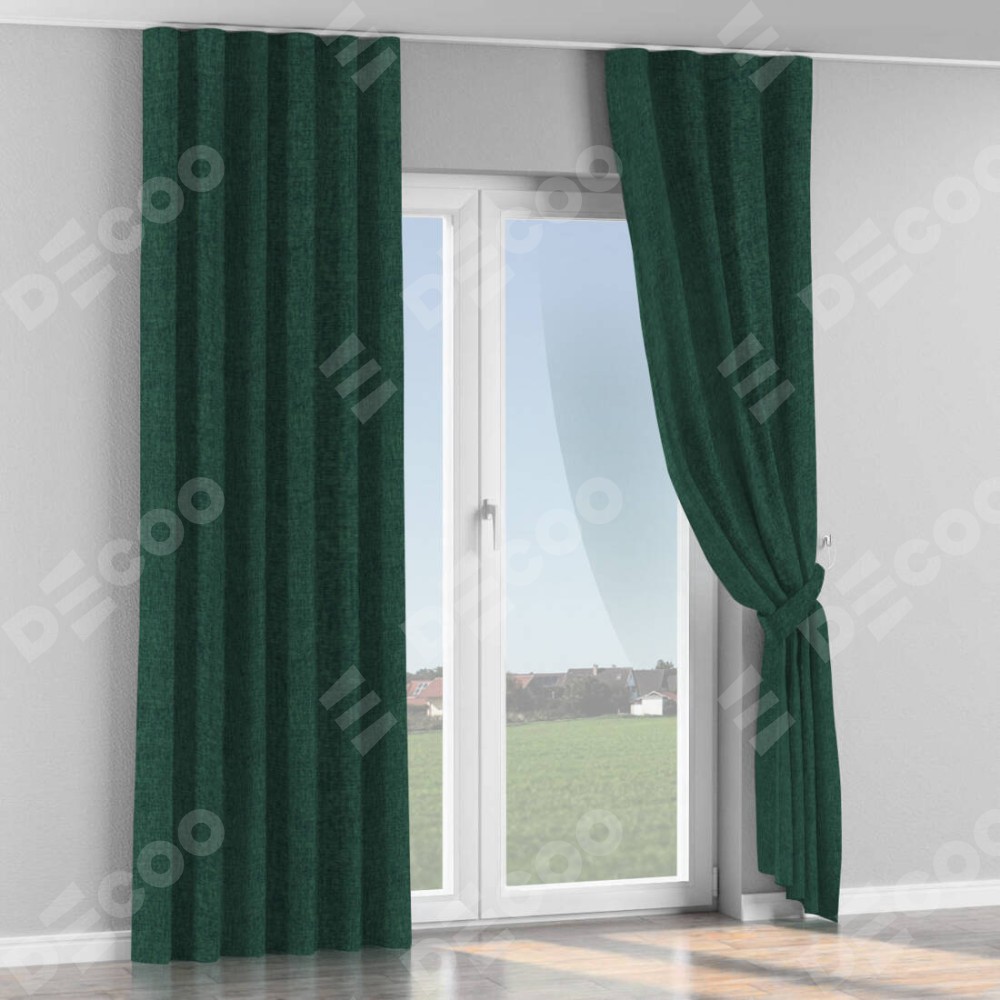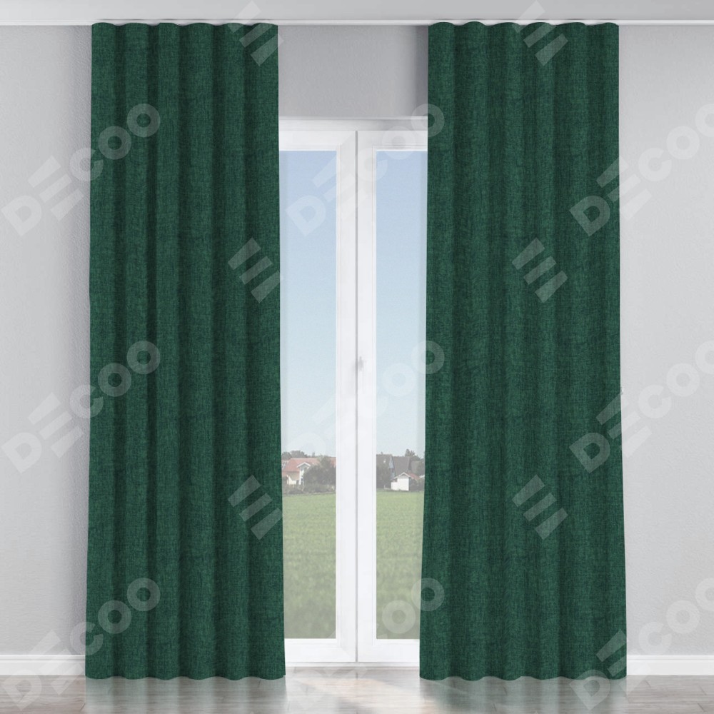 Комплект прямых штор, от производителя «Cortin», пошиты из ткани рогожка димаут тёмно-зелёный, артикул ткани 91022. С изнаночной стороны в верхней части штор пристрачивается шторная лента с декоративными складками «Волна». Для создания элегантных складок прямые шторы шьются по стандарту с коэффициентом 1:2 (на 100 см. ширины проёма 200 см. ширины ткани).