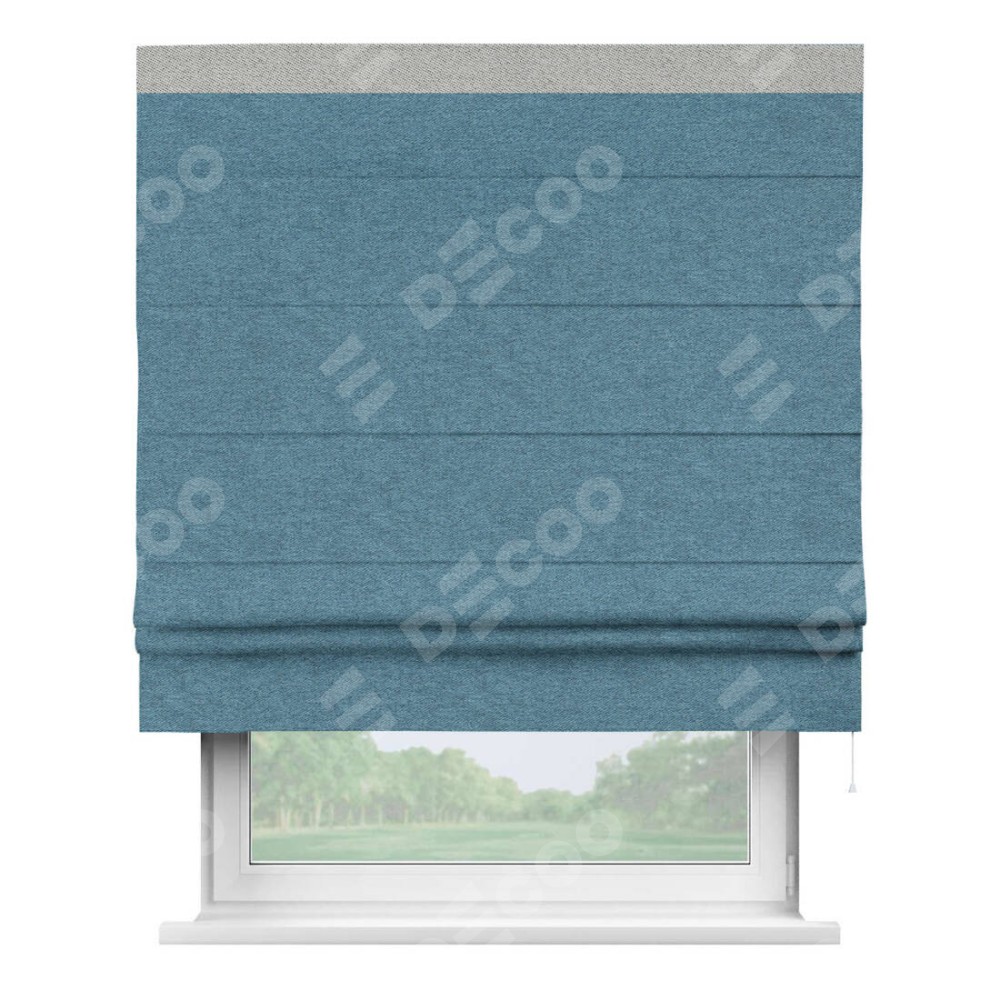 Римская штора пошита из ткани твид блэкаут светло-синий, артикул: 90935, с отделкой кантом «Кинг» отличается своей необычной особенностью: кант располагается исключительно сверху шторы. Такой дизайн делает акцент на верхней части окна, визуально поднимая потолок и придавая интерьеру более возвышенный и изысканный вид. Отделка кантом на верхней кромке не только украшает штору, но и может служить дополнительной защитой от износа в месте наибольшего контакта с механизмом управления шторой.