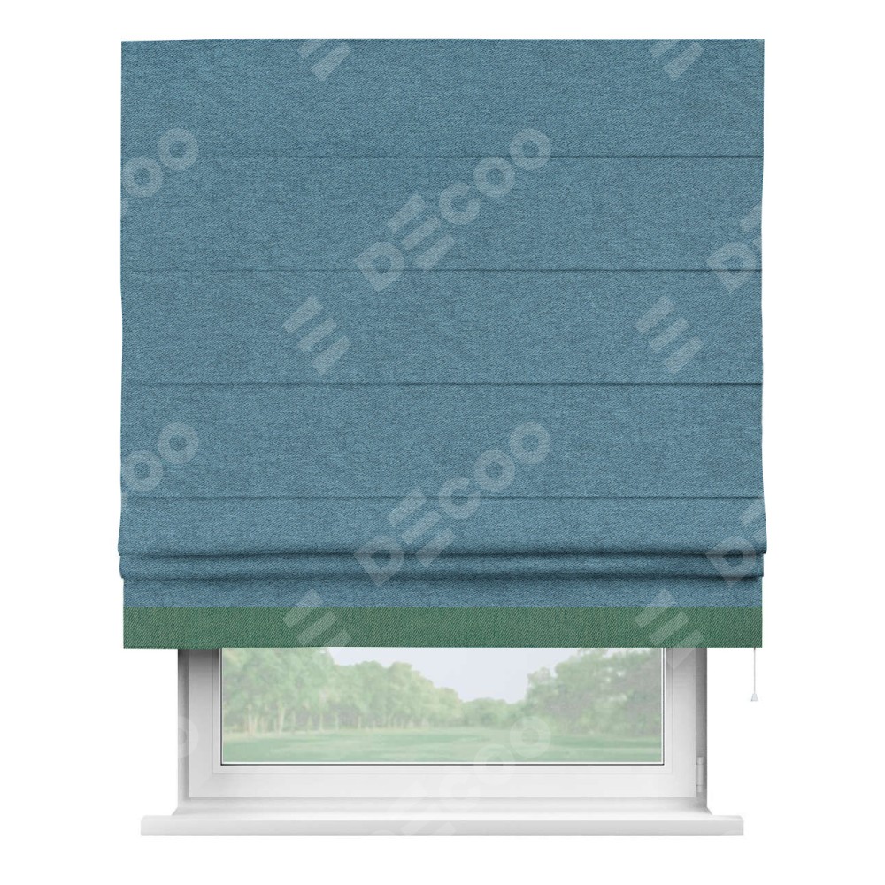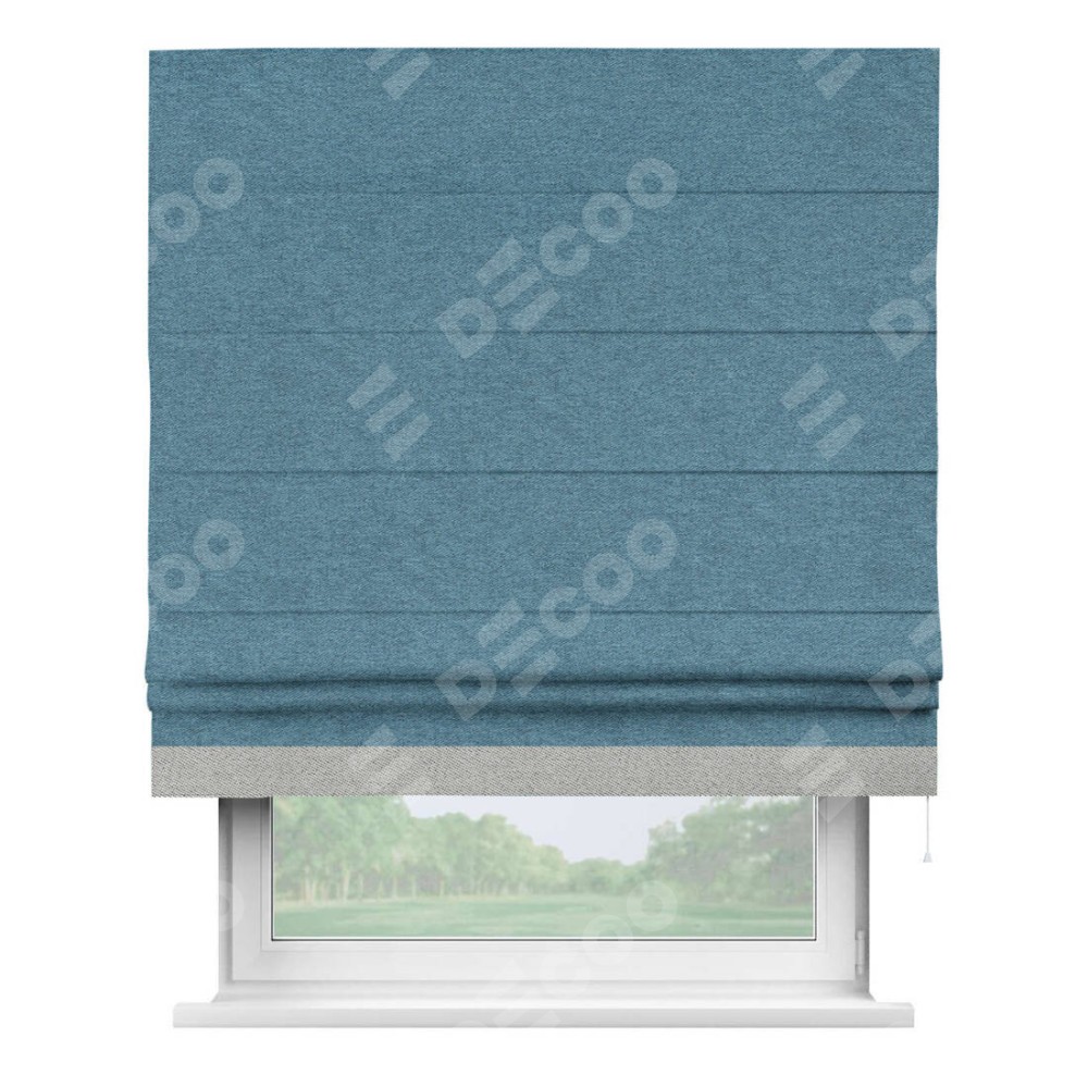 Римская штора пошита из ткани твид блэкаут светло-синий, артикул: 90935, с отделкой кантом «Джестер» выделяется своей уникальной особенностью — кантом, расположенным только снизу шторы. Этот дизайн добавляет оригинальности и игривости оконному оформлению, делая акцент на нижней части шторы и создавая интересный визуальный эффект. Отделка кантом на нижнем крае не только служит эстетической функции, но и способствует увеличению прочности и износостойкости ткани в этом месте.