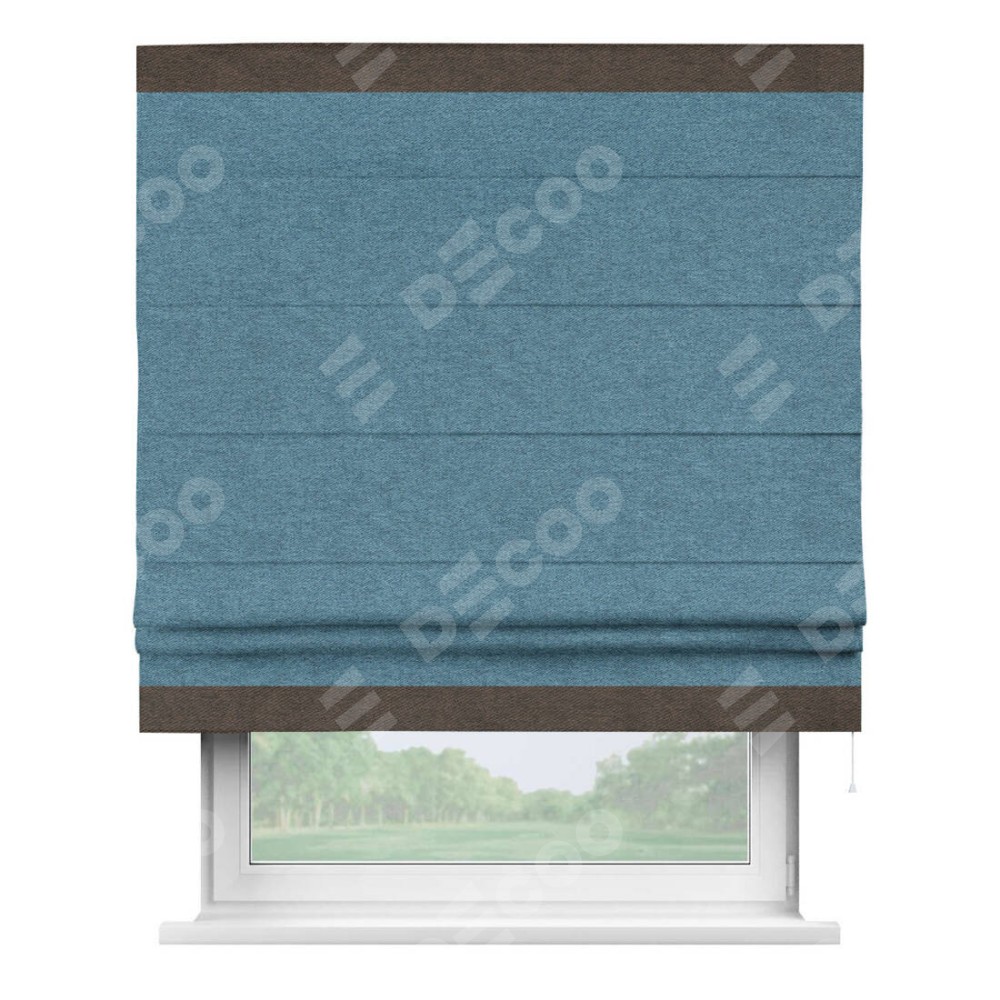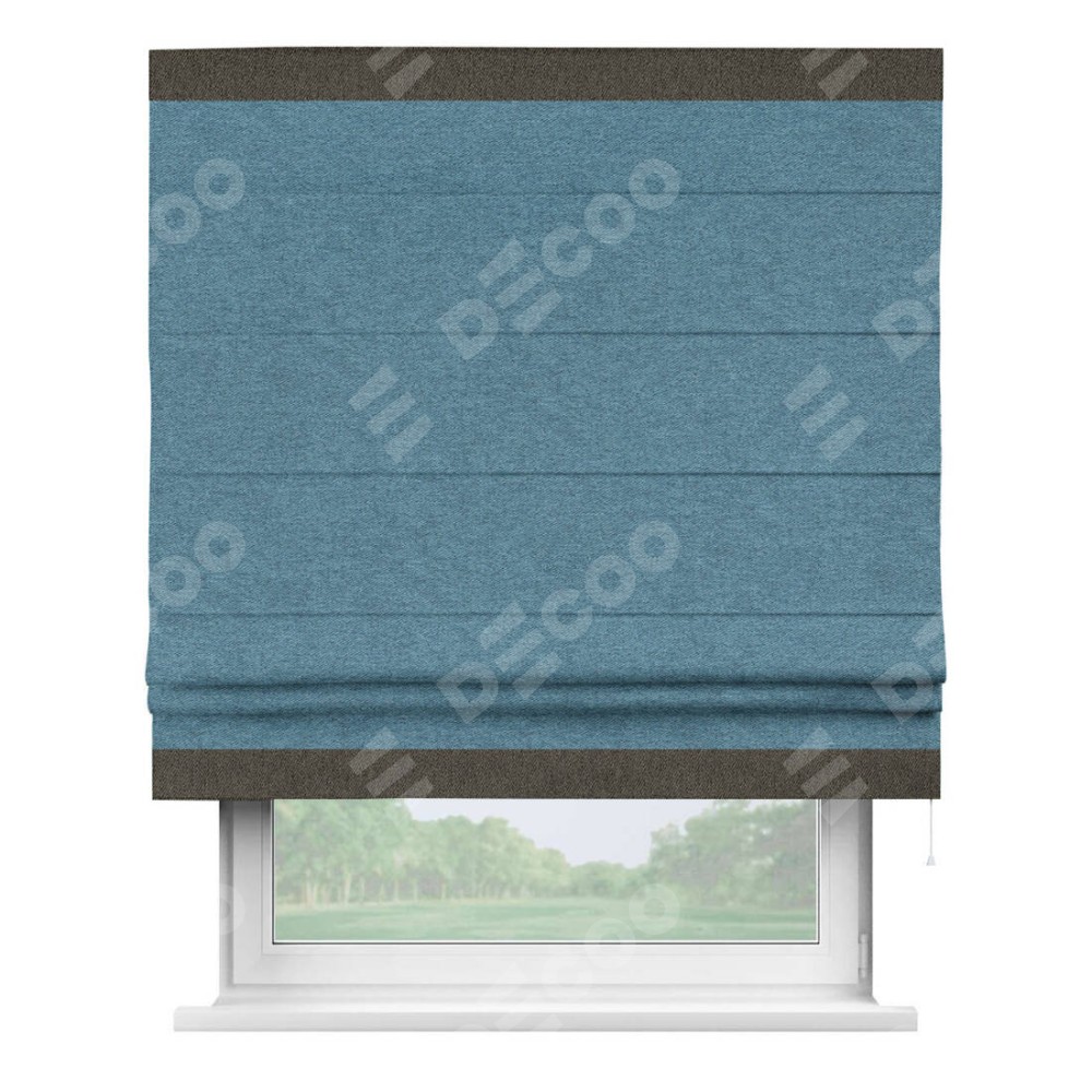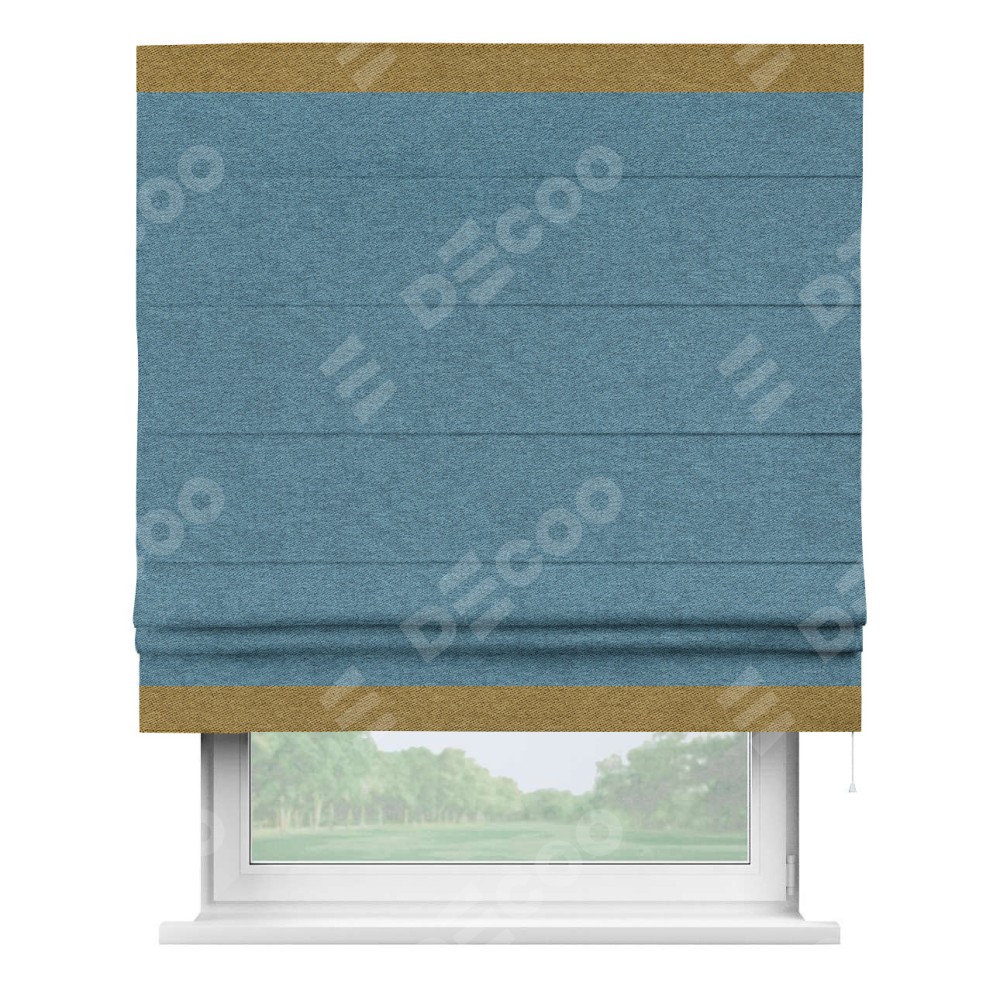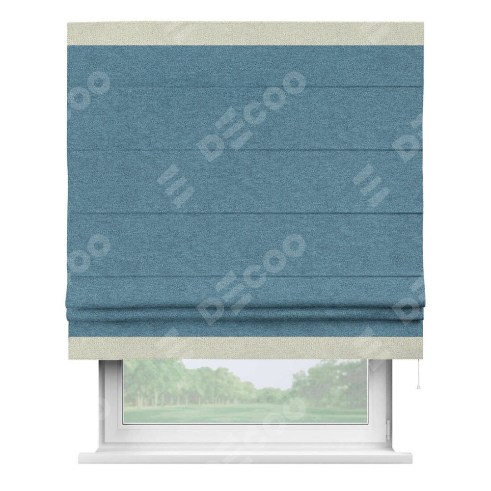 Римская штора пошита из ткани твид блэкаут светло-синий, артикул: 90935, с отделкой кантом «Горизонт» предлагает уникальное дизайнерское решение, при котором кант располагается только вверху и снизу шторы. Такое решение делает акцент на горизонтальных линиях, визуально расширяя пространство и придавая окну более строгий и организованный вид. Отделка кантом в этих ключевых местах не только украшает штору, но и способствует её долговечности, защищая наиболее уязвимые к износу края.