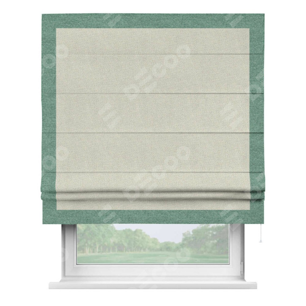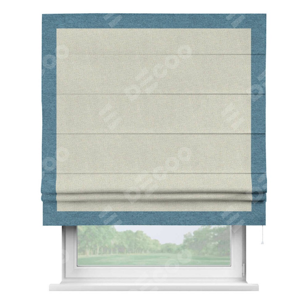Римская штора пошита из ткани твид блэкаут шампань, артикул: 90929, с отделкой кантом «Чесс» отличается своей уникальной деталью — наличием канта не только по бокам и снизу, но и сверху по всем краям шторы. Это придает шторе особенно аккуратный и завершенный вид, делая акцент на границах и форме шторы. Отделка кантом по всему периметру шторы усиливает её декоративные качества и подчеркивает строгую геометрию, что может быть особенно актуально для современных и минималистичных интерьеров.