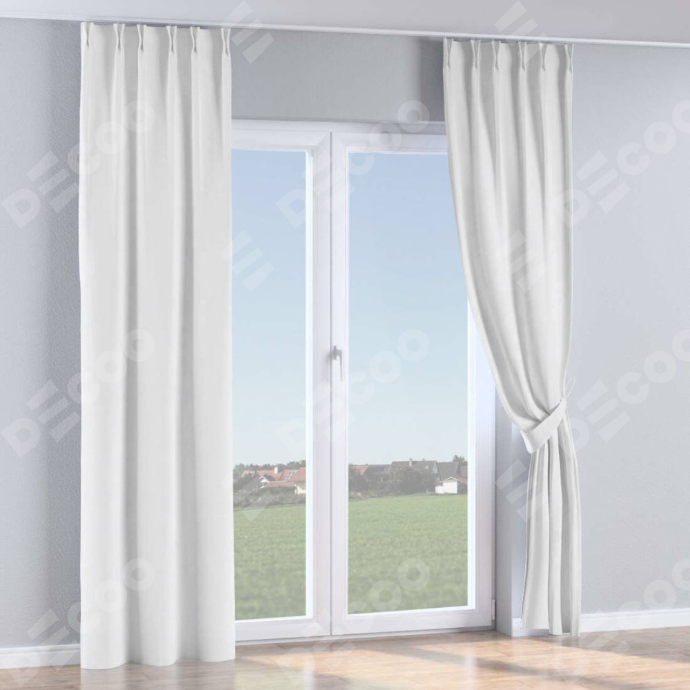 Комплект прямых штор, от производителя «Cortin», пошиты из ткани вельвет белоснежный, артикул ткани 92698. С изнаночной стороны в верхней части штор пристрачивается шторная лента с декоративными складками «Кустик». Для создания элегантных складок прямые шторы шьются по стандарту с коэффициентом 1:2 (на 100 см. ширины проёма 200 см. ширины ткани).