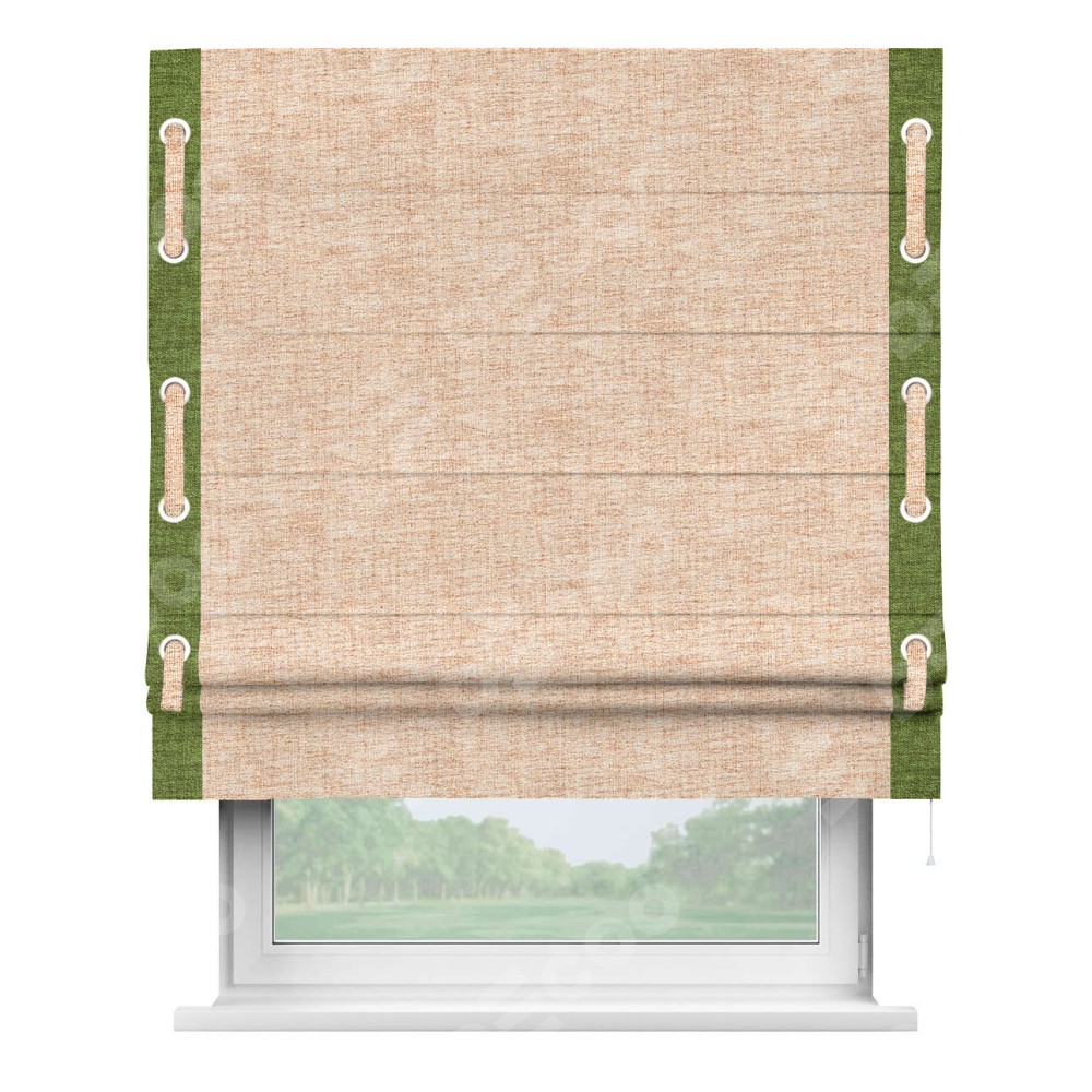 Римская штора «Кортин» для проёма, рогожка димаут персиковый, с кантом Стрим Дуо (люверсы с пояском)