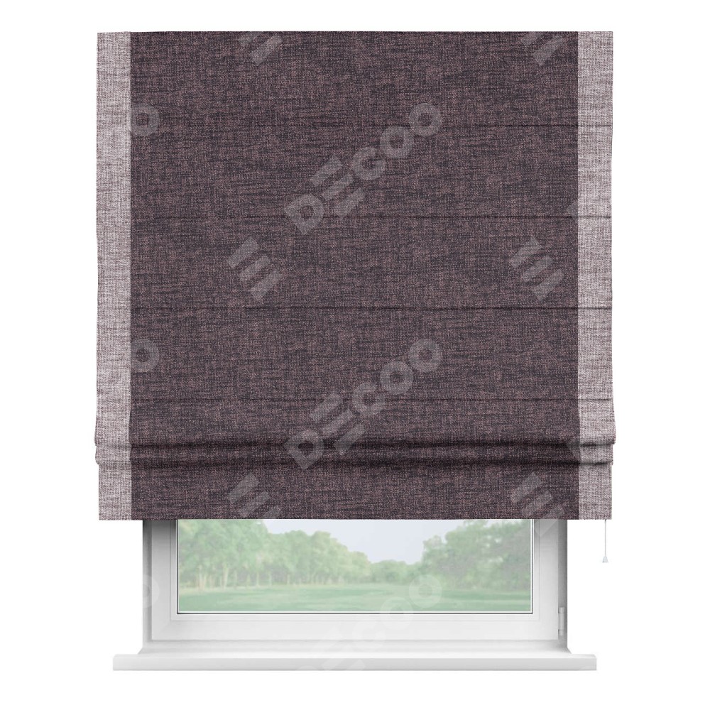 Римская штора пошита из ткани рогожка димаут розово-коричневый, артикул: 91020, с отделкой кантом «Стрим Дуо» выделяется наличием кантов по обоим бокам шторы, слева и справа. Этот дизайн придает шторе аккуратный и завершенный вид, акцентируя вертикальные линии и визуально вытягивая окно в высоту. Отделка кантом по бокам не только украшает штору, но и служит практической функцией, укрепляя края и продлевая срок службы изделия.