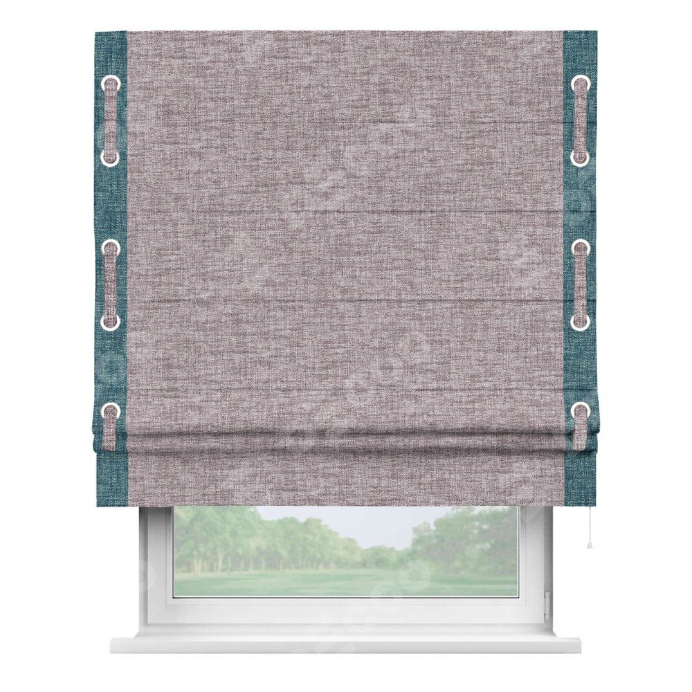 Римская штора «Кортин» для проёма, рогожка димаут розовый кварц, с кантом Стрим Дуо (люверсы с пояском)