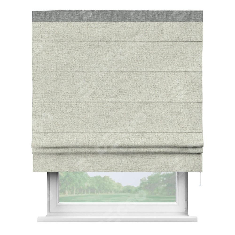 Римская штора пошита из ткани рогожка димаут серо-бежевый, артикул: 91014, с отделкой кантом «Кинг» отличается своей необычной особенностью: кант располагается исключительно сверху шторы. Такой дизайн делает акцент на верхней части окна, визуально поднимая потолок и придавая интерьеру более возвышенный и изысканный вид. Отделка кантом на верхней кромке не только украшает штору, но и может служить дополнительной защитой от износа в месте наибольшего контакта с механизмом управления шторой.