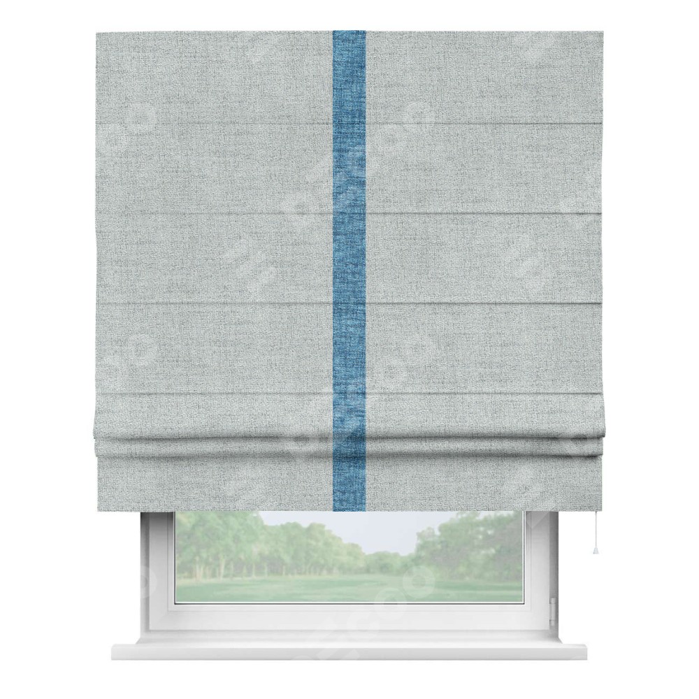 Римская штора пошита из ткани рогожка димаут серый, артикул: 91027, с отделкой кантом «Хайвэй» представляет собой уникальное и смелое дизайнерское решение, где кант расположен вертикально посередине шторы. Этот дизайн не только выделяет штору среди других вариантов оформления окон, но и создает интересный визуальный акцент, привлекая внимание к центру окна и разделяя штору на визуальные зоны. Такой нестандартный подход добавляет динамичности интерьеру и может быть использован для подчеркивания особенностей оформления помещения.