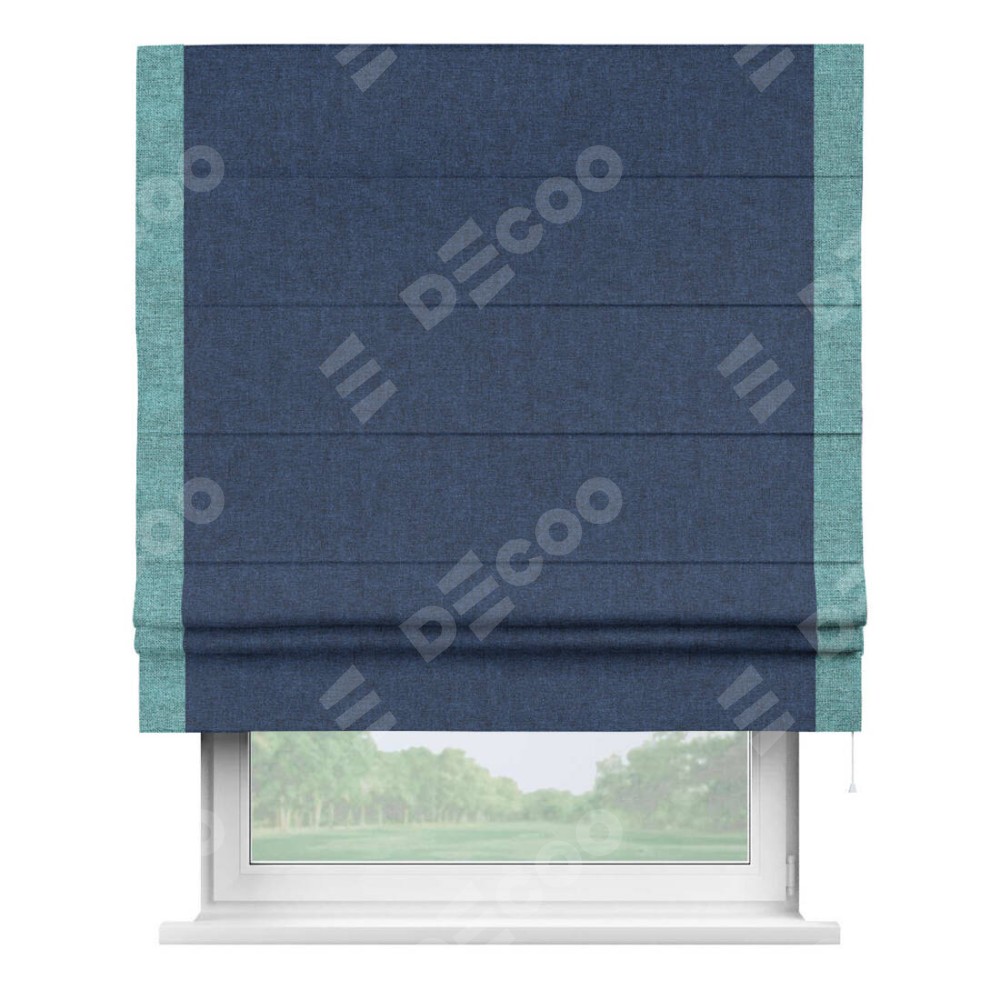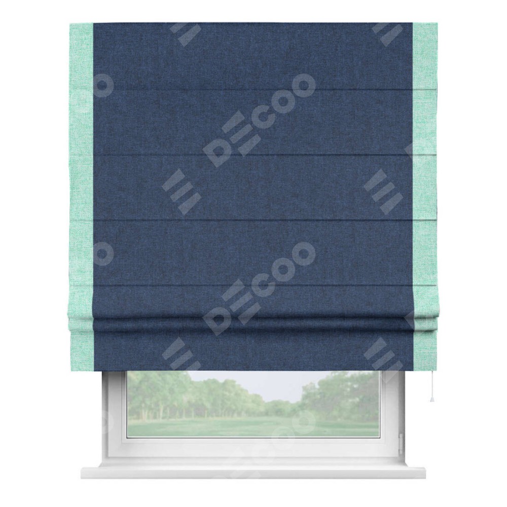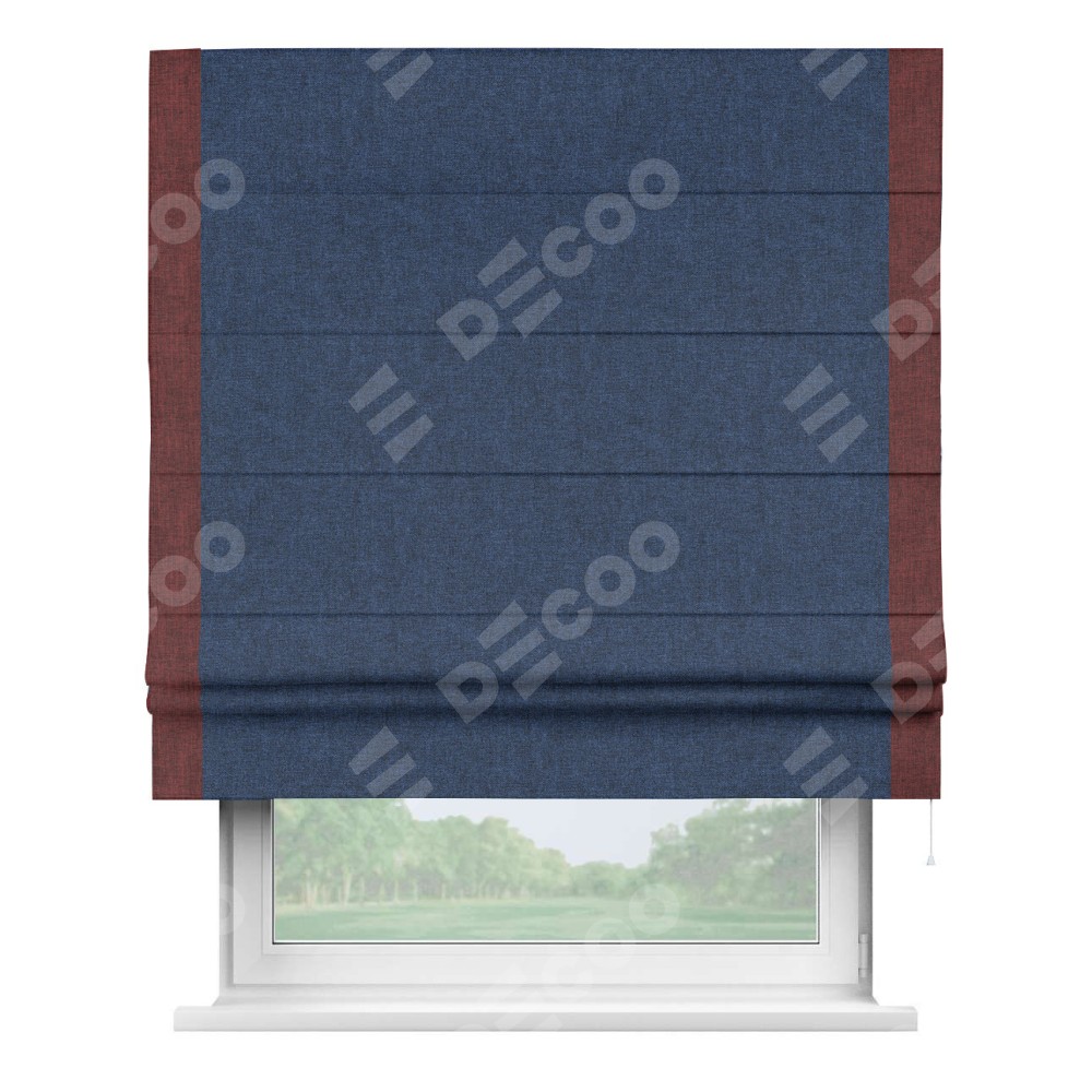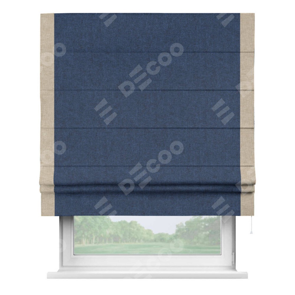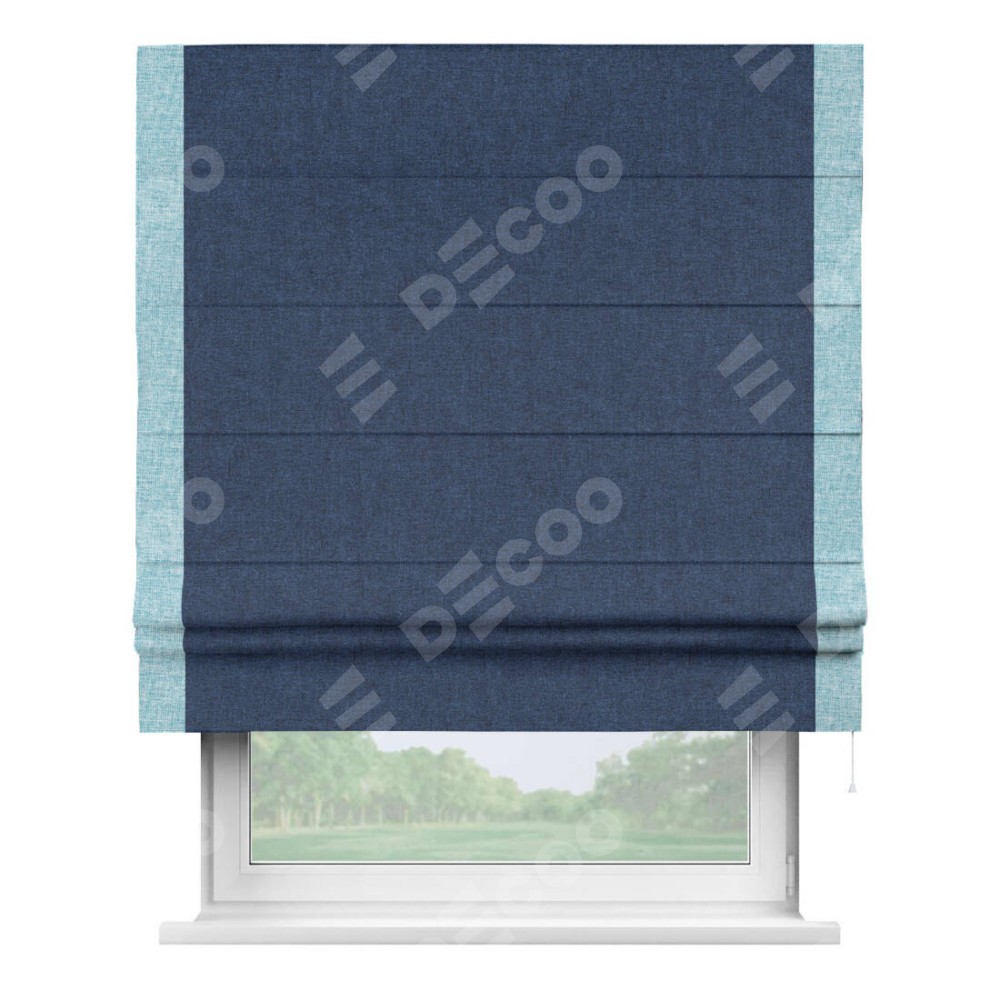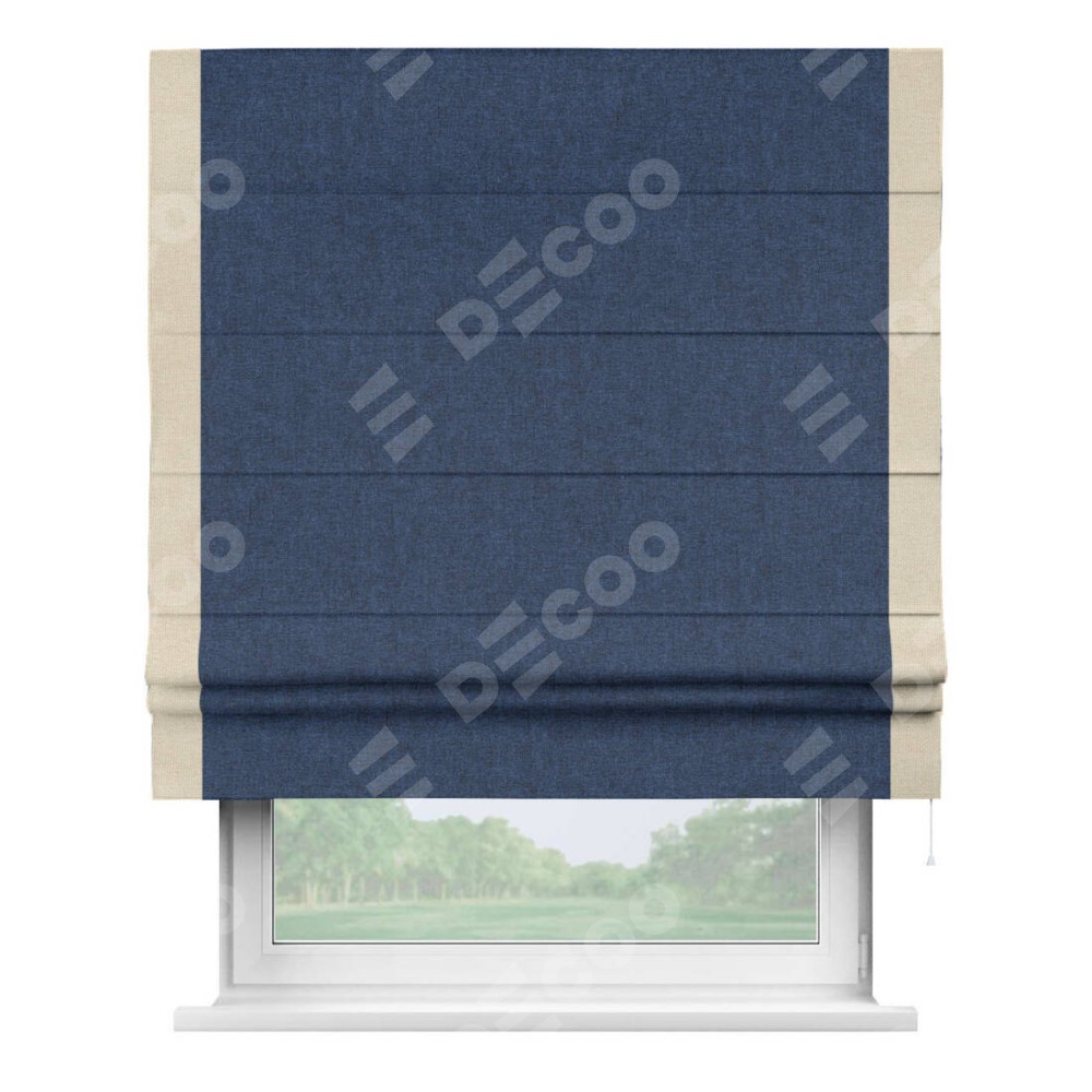 Римская штора пошита из ткани лён кашемир тёмно-синий, артикул: 17215, с отделкой кантом «Стрим Дуо» выделяется наличием кантов по обоим бокам шторы, слева и справа. Этот дизайн придает шторе аккуратный и завершенный вид, акцентируя вертикальные линии и визуально вытягивая окно в высоту. Отделка кантом по бокам не только украшает штору, но и служит практической функцией, укрепляя края и продлевая срок службы изделия.