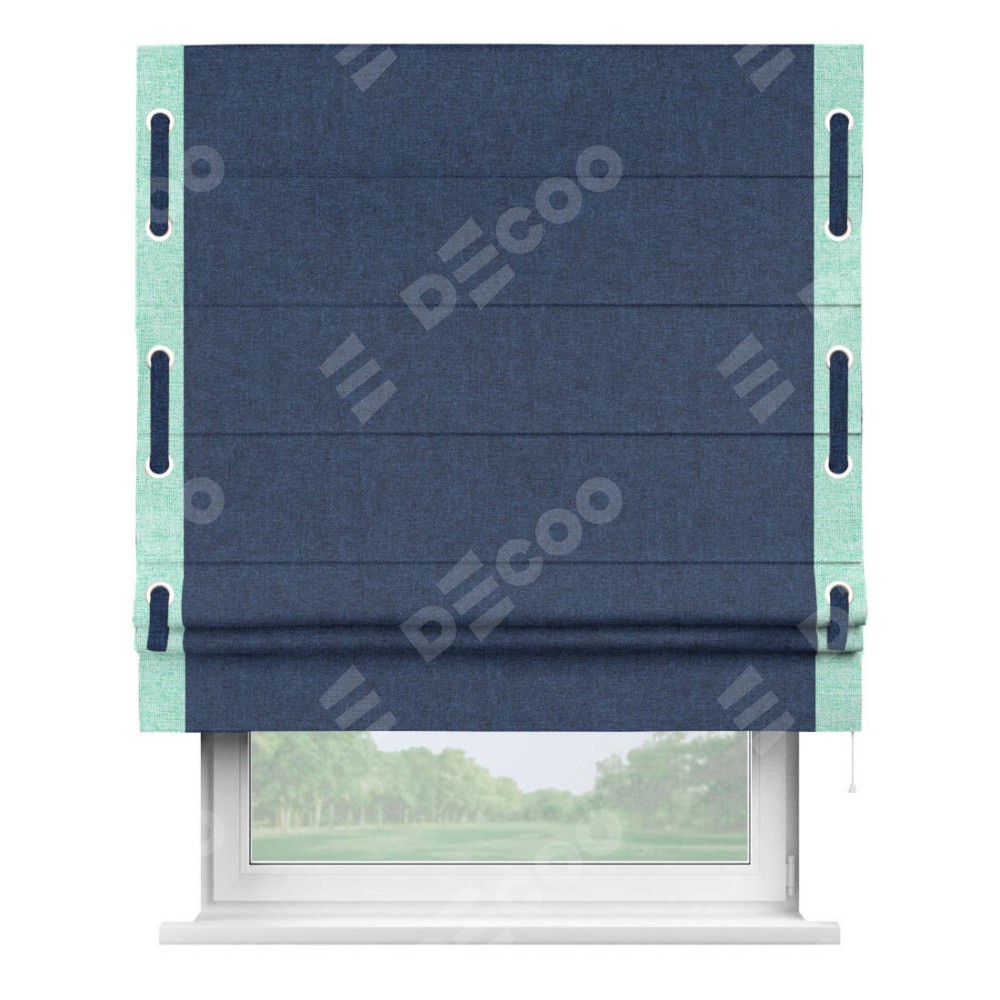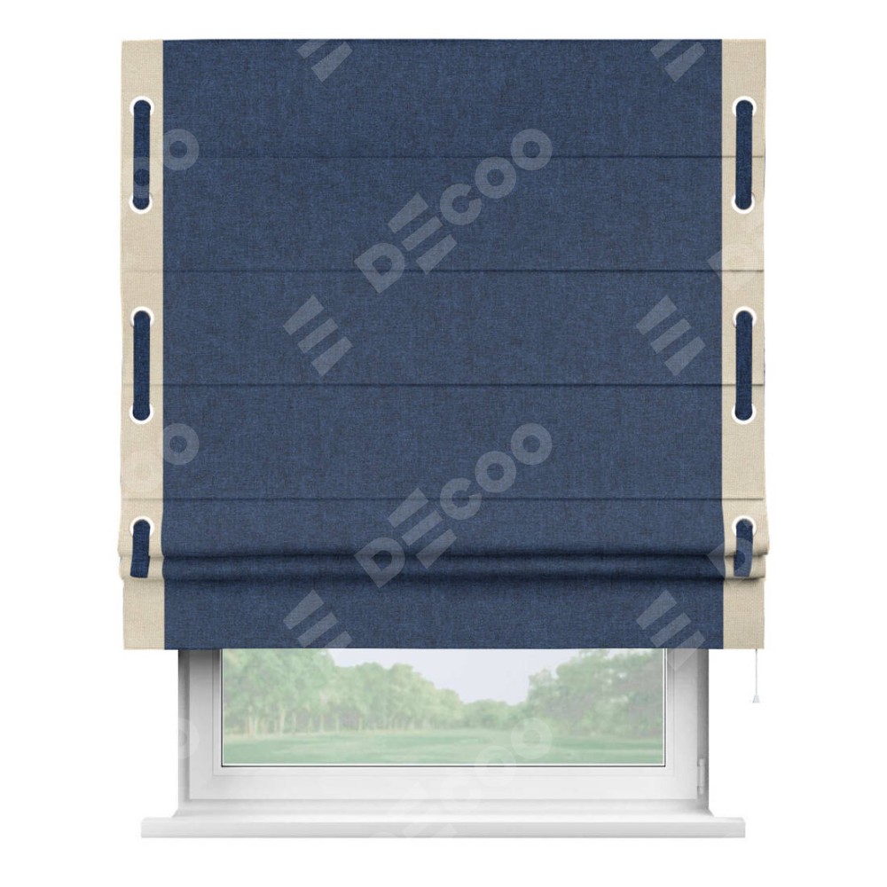 Римская штора «Кортин» для проёма, лён кашемир тёмно-синий, с кантом Стрим Дуо (люверсы с пояском)
