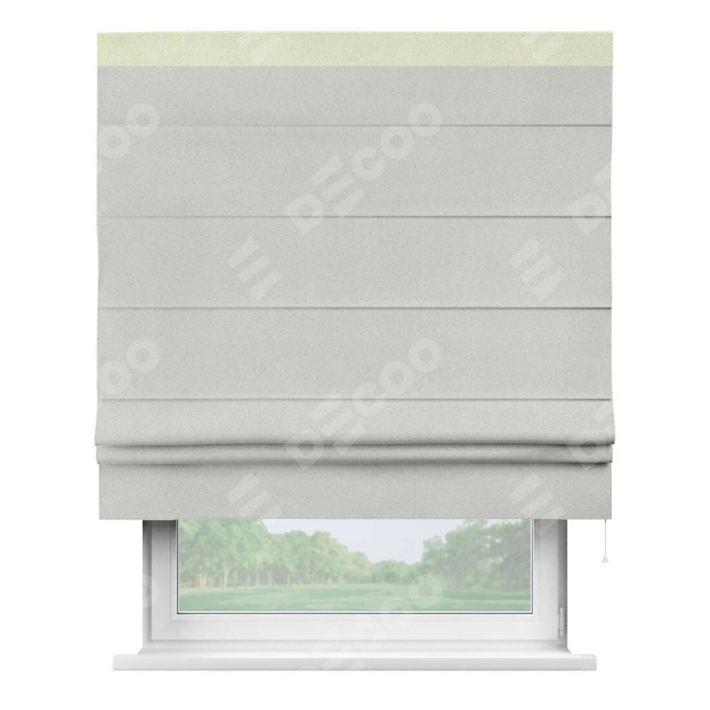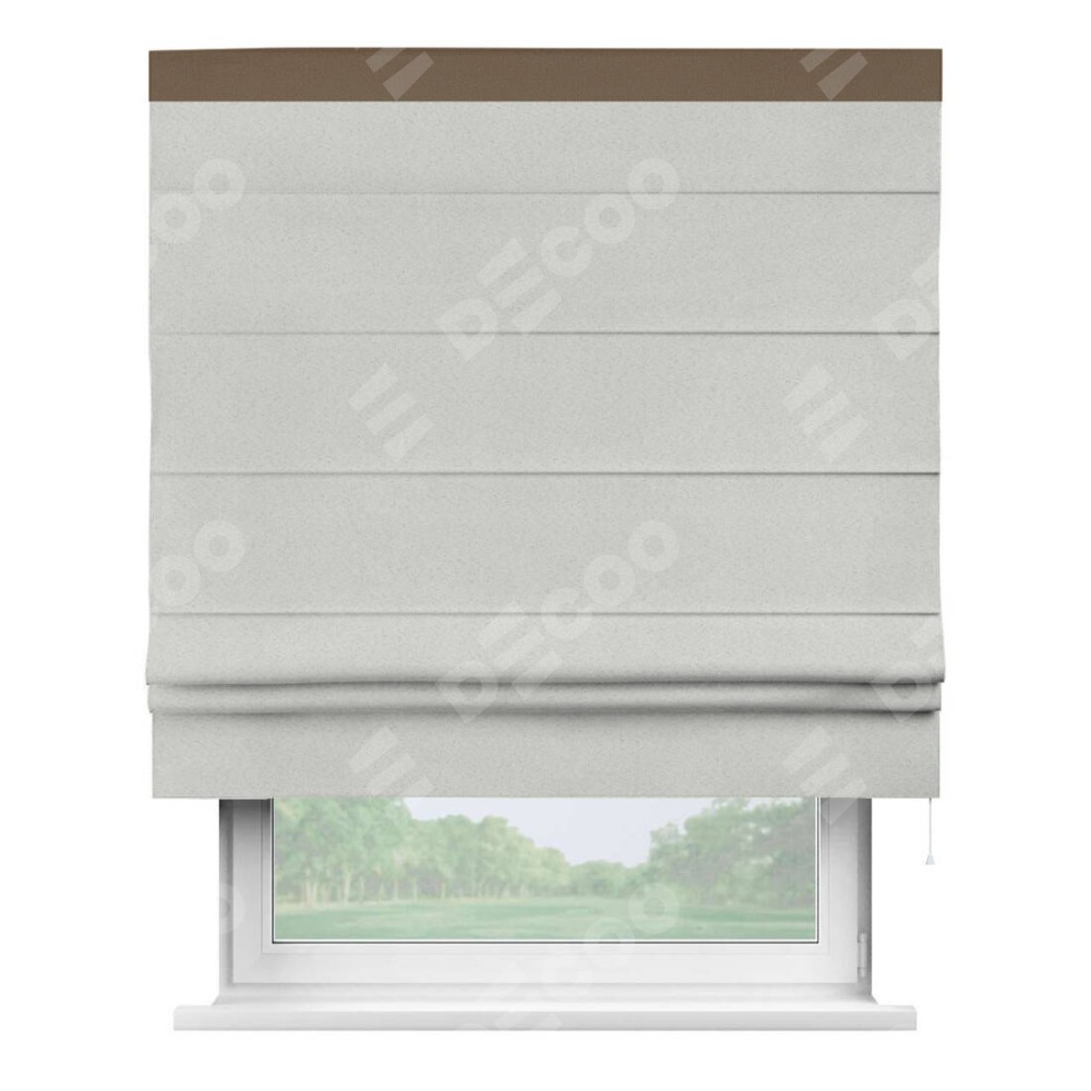 Римская штора пошита из ткани однотонный блэкаут милк, артикул: 23, с отделкой кантом «Кинг» отличается своей необычной особенностью: кант располагается исключительно сверху шторы. Такой дизайн делает акцент на верхней части окна, визуально поднимая потолок и придавая интерьеру более возвышенный и изысканный вид. Отделка кантом на верхней кромке не только украшает штору, но и может служить дополнительной защитой от износа в месте наибольшего контакта с механизмом управления шторой.