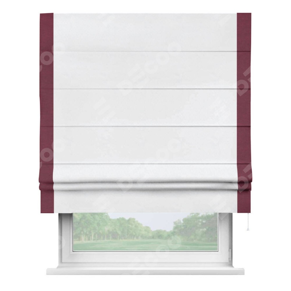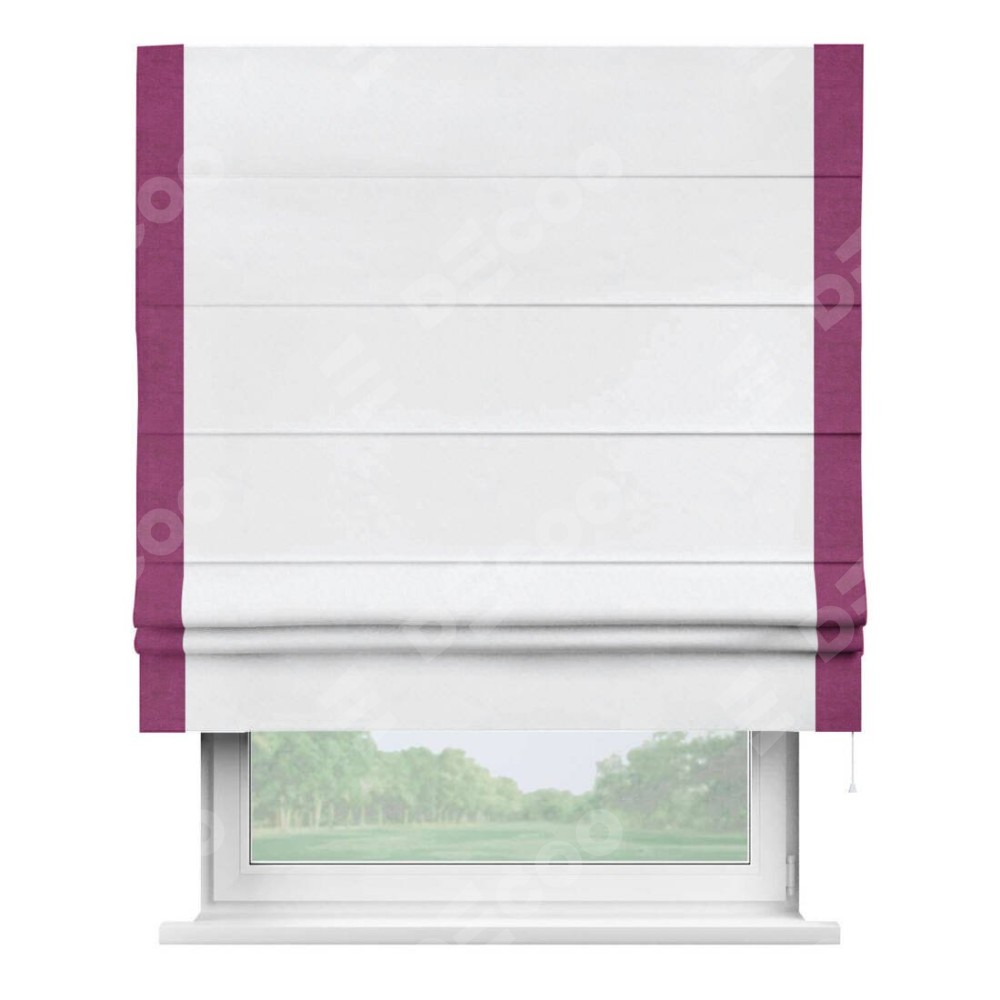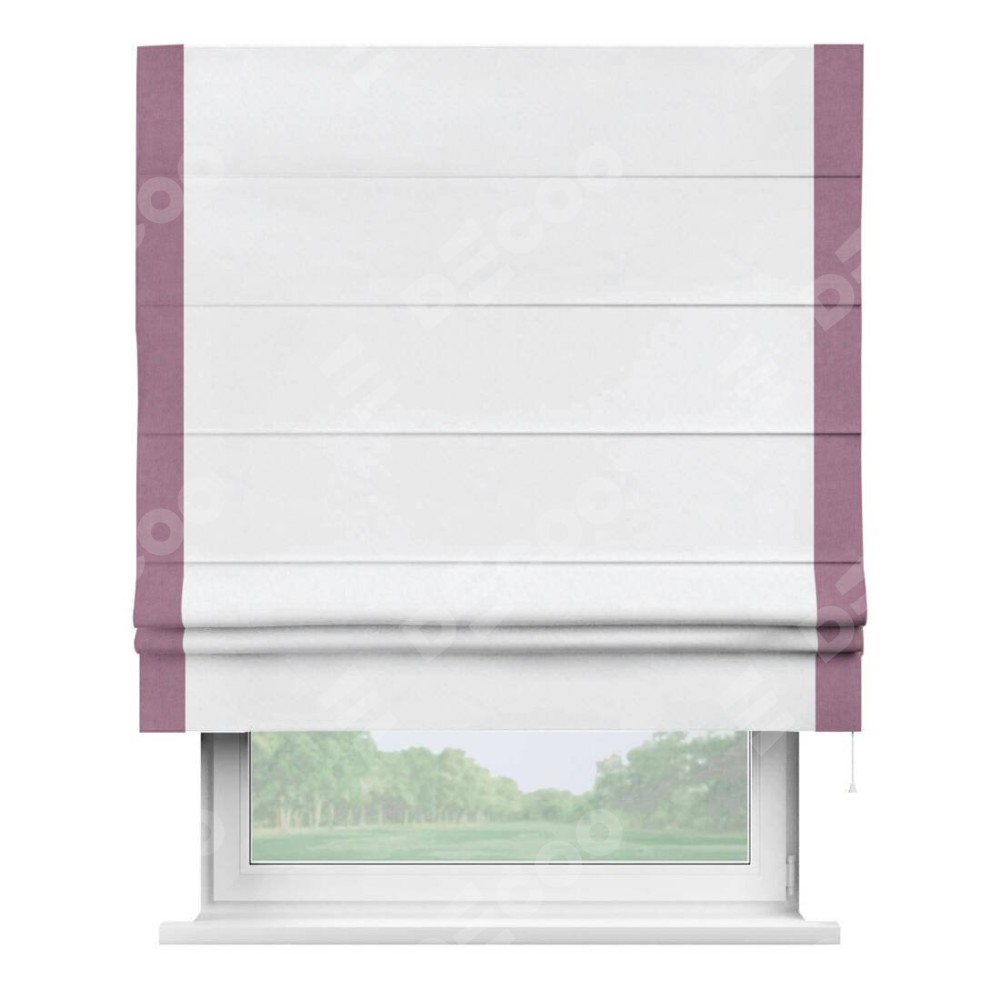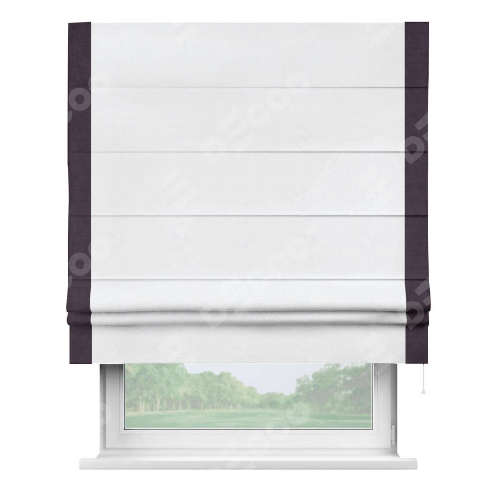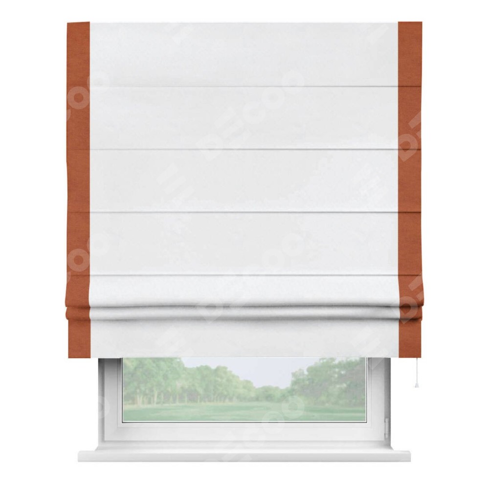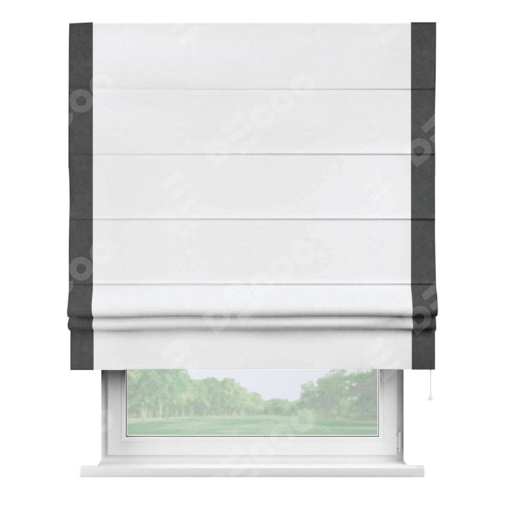 Римская штора пошита из ткани вельвет белоснежный, артикул: 92698, с отделкой кантом «Стрим Дуо» выделяется наличием кантов по обоим бокам шторы, слева и справа. Этот дизайн придает шторе аккуратный и завершенный вид, акцентируя вертикальные линии и визуально вытягивая окно в высоту. Отделка кантом по бокам не только украшает штору, но и служит практической функцией, укрепляя края и продлевая срок службы изделия.