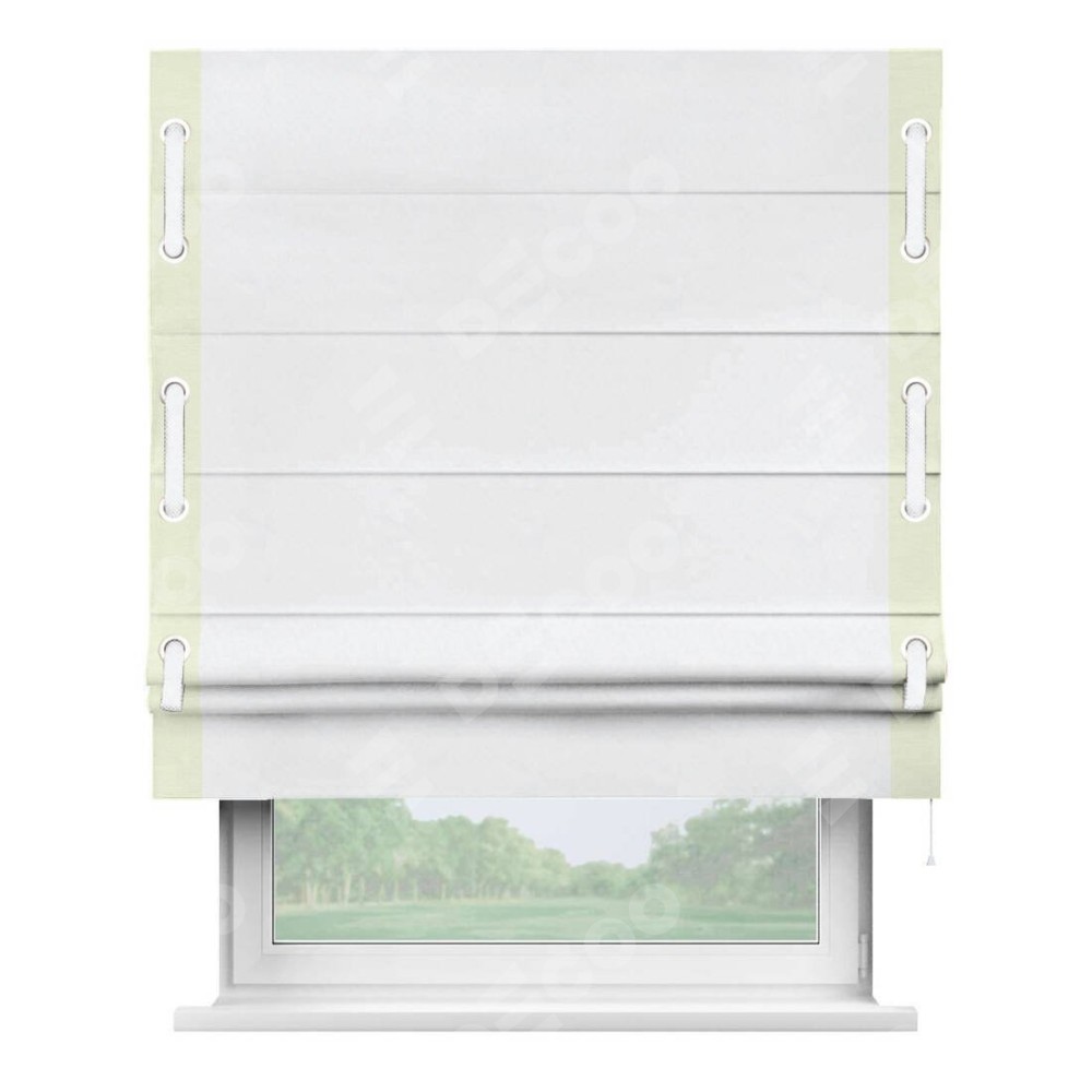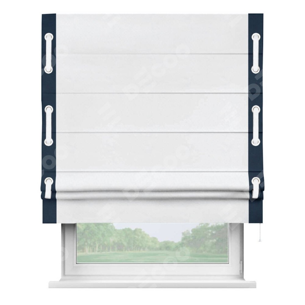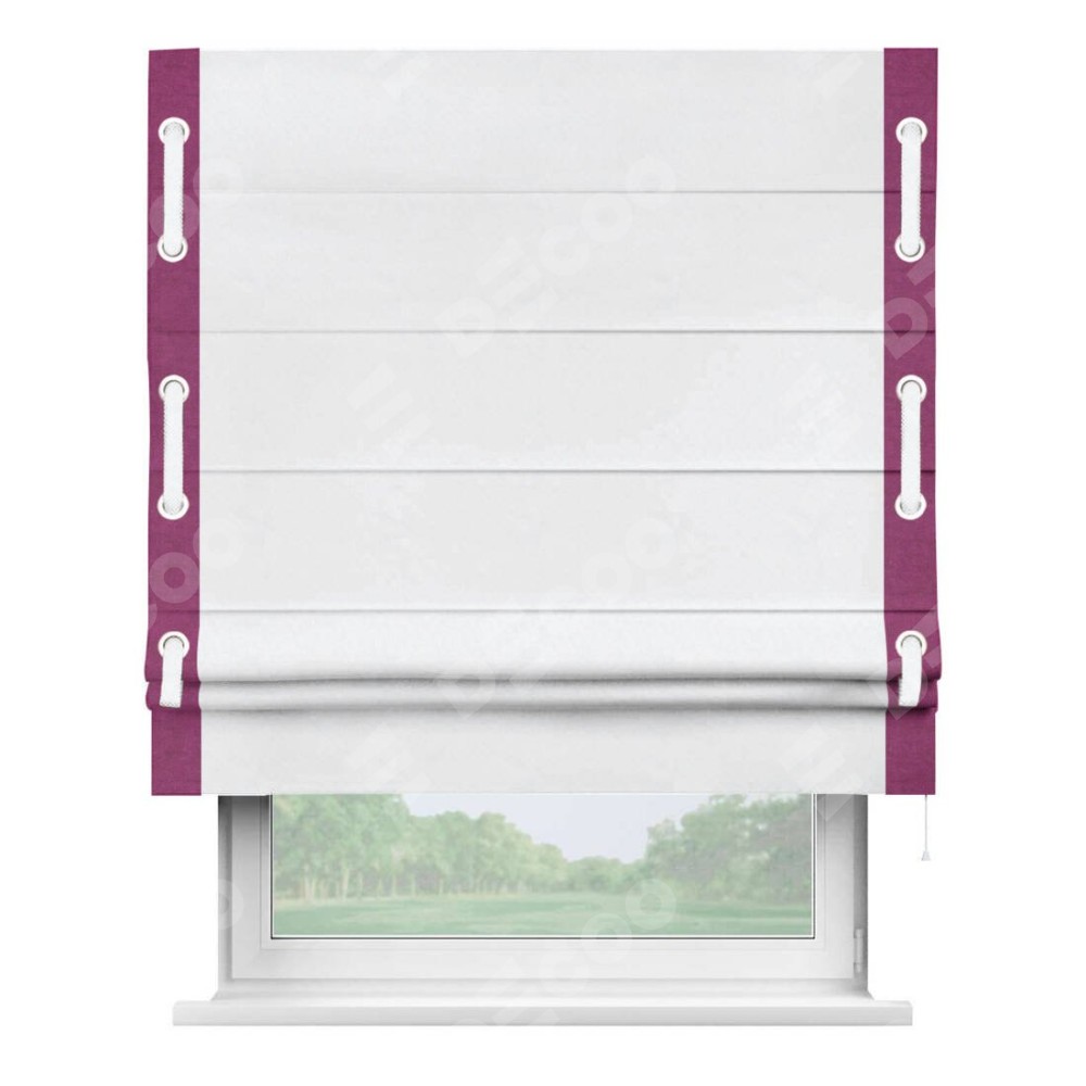 Римская штора пошита из ткани вельвет белоснежный, артикул: 92698, с отделкой кантом «Стрим Дуо», дополненная декоративными люверсами на этих кантах и протянутым пояском из основного цвета римской шторы, представляет собой высоко декоративное и функциональное решение для оконного оформления. Канты, расположенные по обеим боковым сторонам шторы, уже добавляют изысканности и завершенности внешнему виду. Добавление люверсов и пояска не только усиливает декоративный эффект, но и придает шторе дополнительную текстурность и глубину.