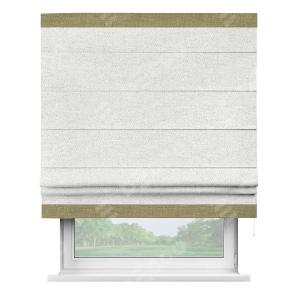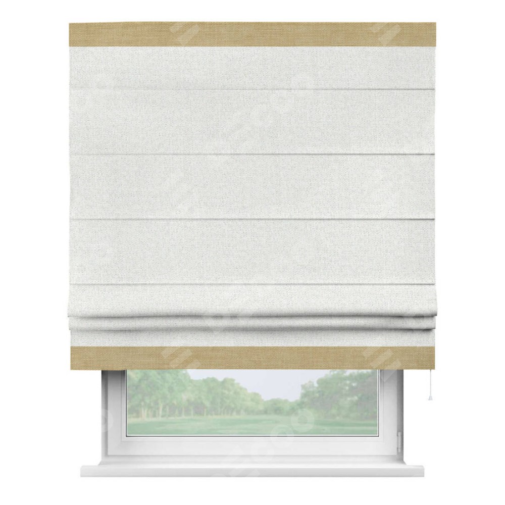 Римская штора пошита из ткани лён шампань, артикул: 91399, с отделкой кантом «Горизонт» предлагает уникальное дизайнерское решение, при котором кант располагается только вверху и снизу шторы. Такое решение делает акцент на горизонтальных линиях, визуально расширяя пространство и придавая окну более строгий и организованный вид. Отделка кантом в этих ключевых местах не только украшает штору, но и способствует её долговечности, защищая наиболее уязвимые к износу края.