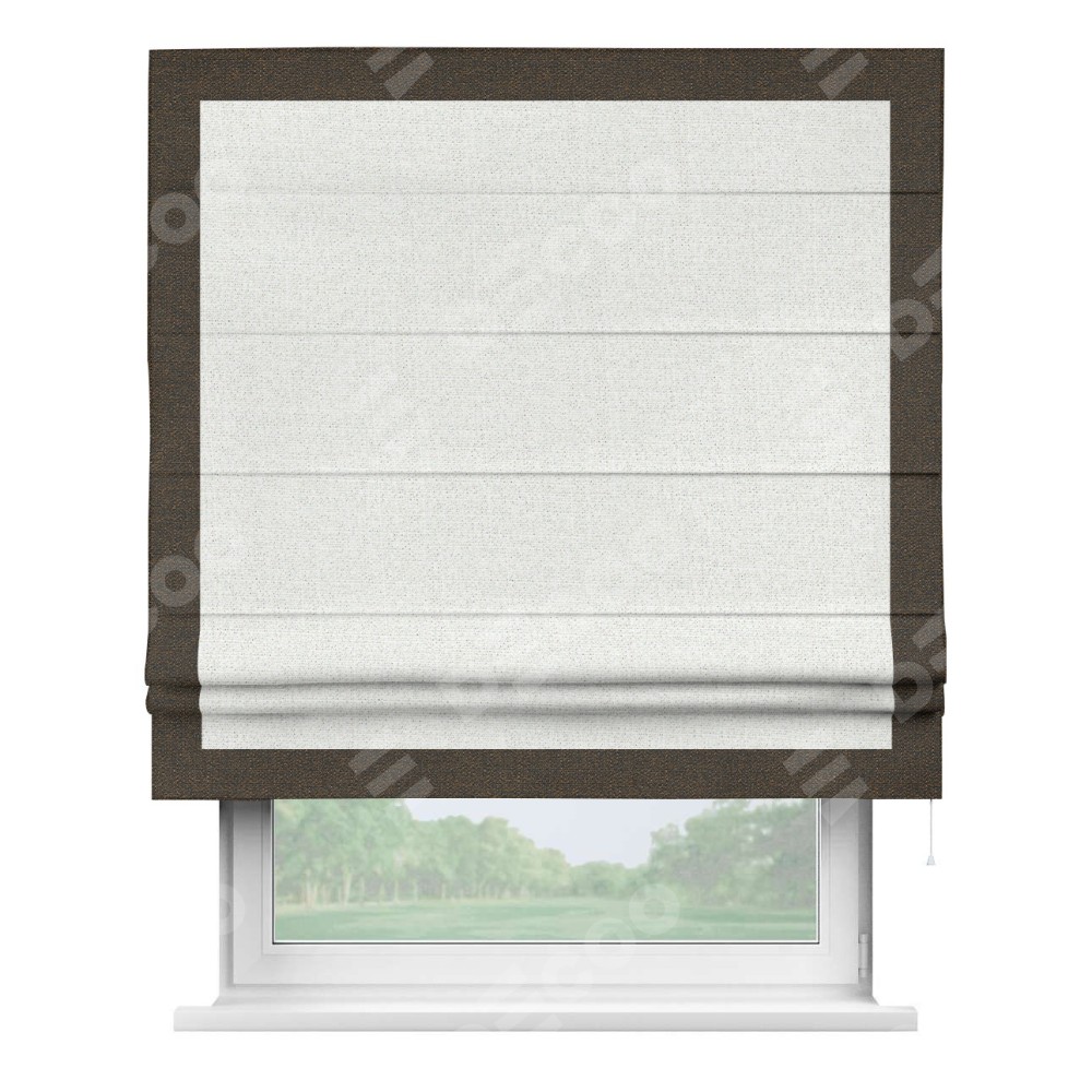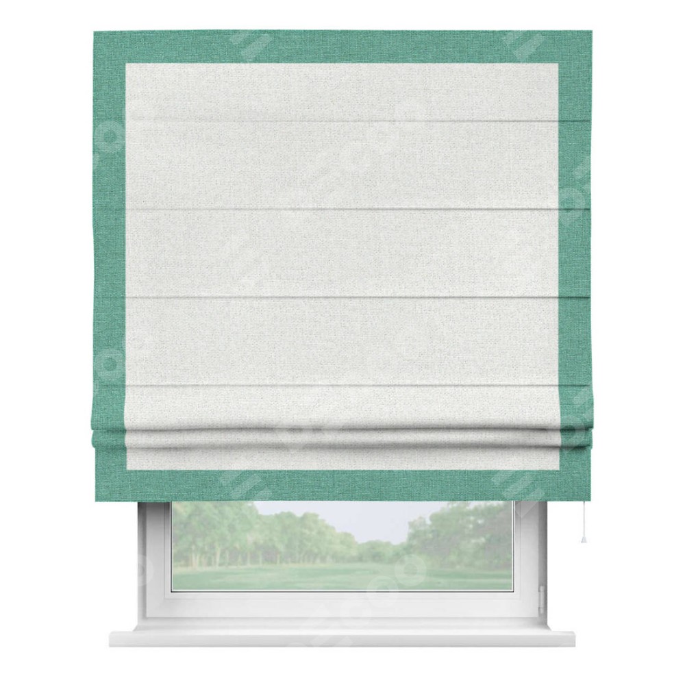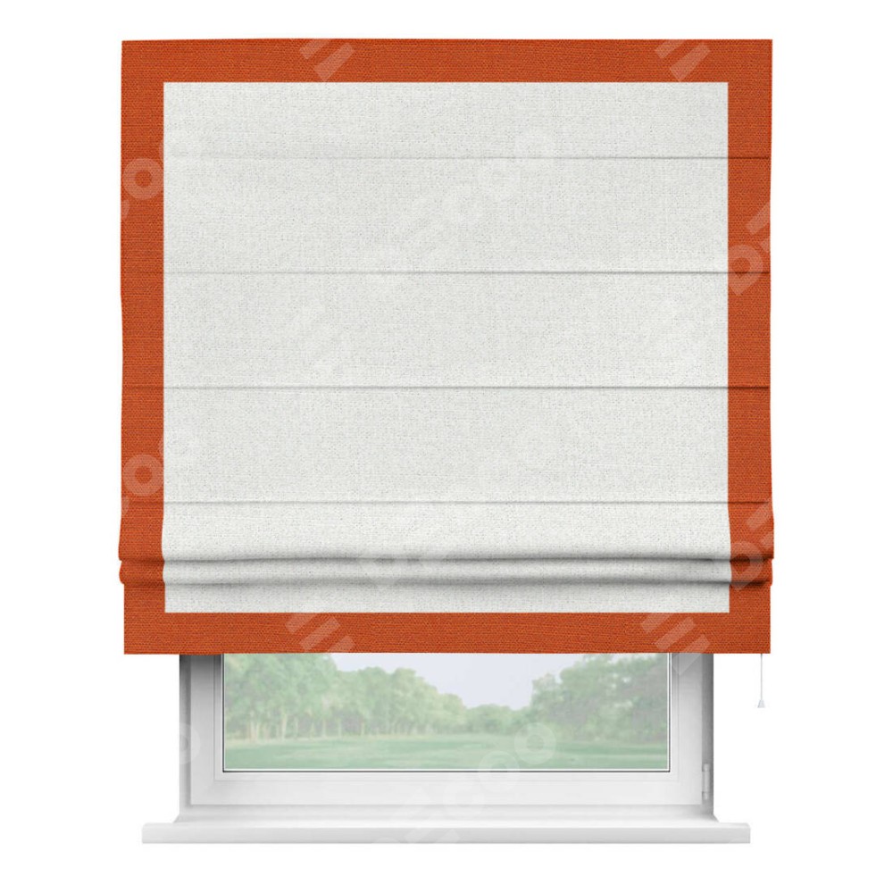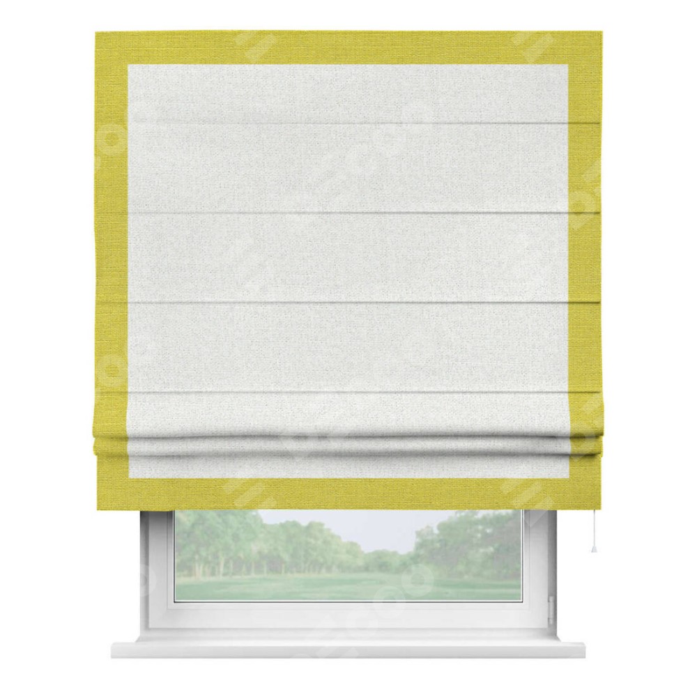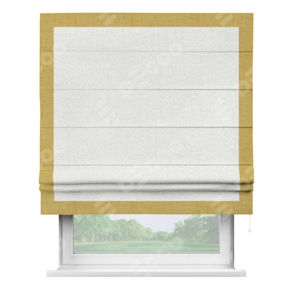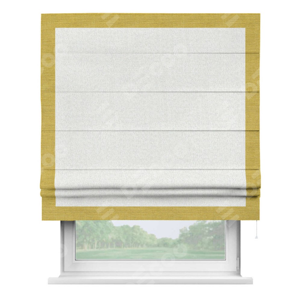 Римская штора пошита из ткани лён шампань, артикул: 91399, с отделкой кантом «Чесс» отличается своей уникальной деталью — наличием канта не только по бокам и снизу, но и сверху по всем краям шторы. Это придает шторе особенно аккуратный и завершенный вид, делая акцент на границах и форме шторы. Отделка кантом по всему периметру шторы усиливает её декоративные качества и подчеркивает строгую геометрию, что может быть особенно актуально для современных и минималистичных интерьеров.