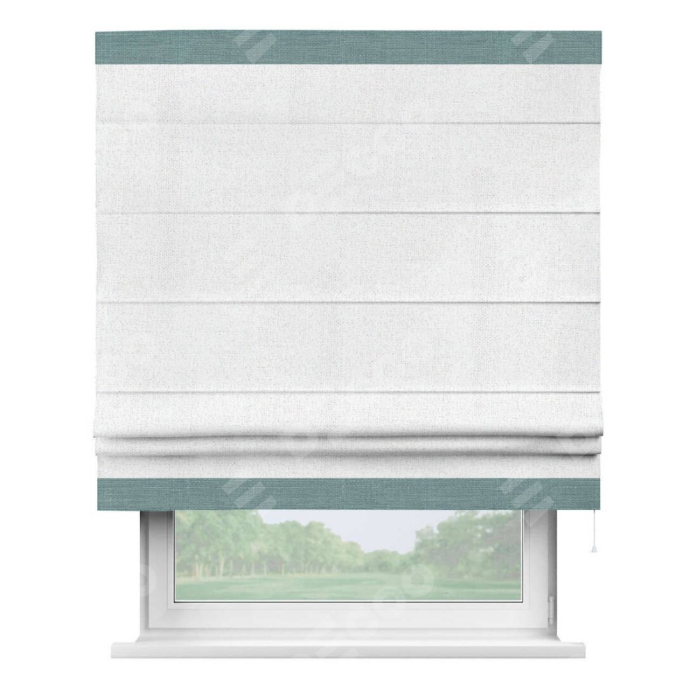 Римская штора пошита из ткани лён белоснежный, артикул: 95632, с отделкой кантом «Горизонт» предлагает уникальное дизайнерское решение, при котором кант располагается только вверху и снизу шторы. Такое решение делает акцент на горизонтальных линиях, визуально расширяя пространство и придавая окну более строгий и организованный вид. Отделка кантом в этих ключевых местах не только украшает штору, но и способствует её долговечности, защищая наиболее уязвимые к износу края.