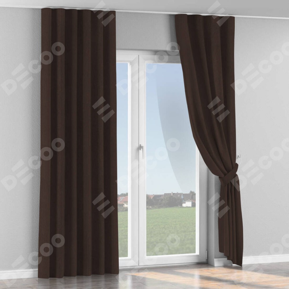 Комплект прямых штор, от производителя «Cortin», пошиты из ткани лён димаут венге, артикул ткани 91001. С изнаночной стороны в верхней части штор пристрачивается шторная лента с декоративными складками «Волна». Для создания элегантных складок прямые шторы шьются по стандарту с коэффициентом 1:2 (на 100 см. ширины проёма 200 см. ширины ткани).