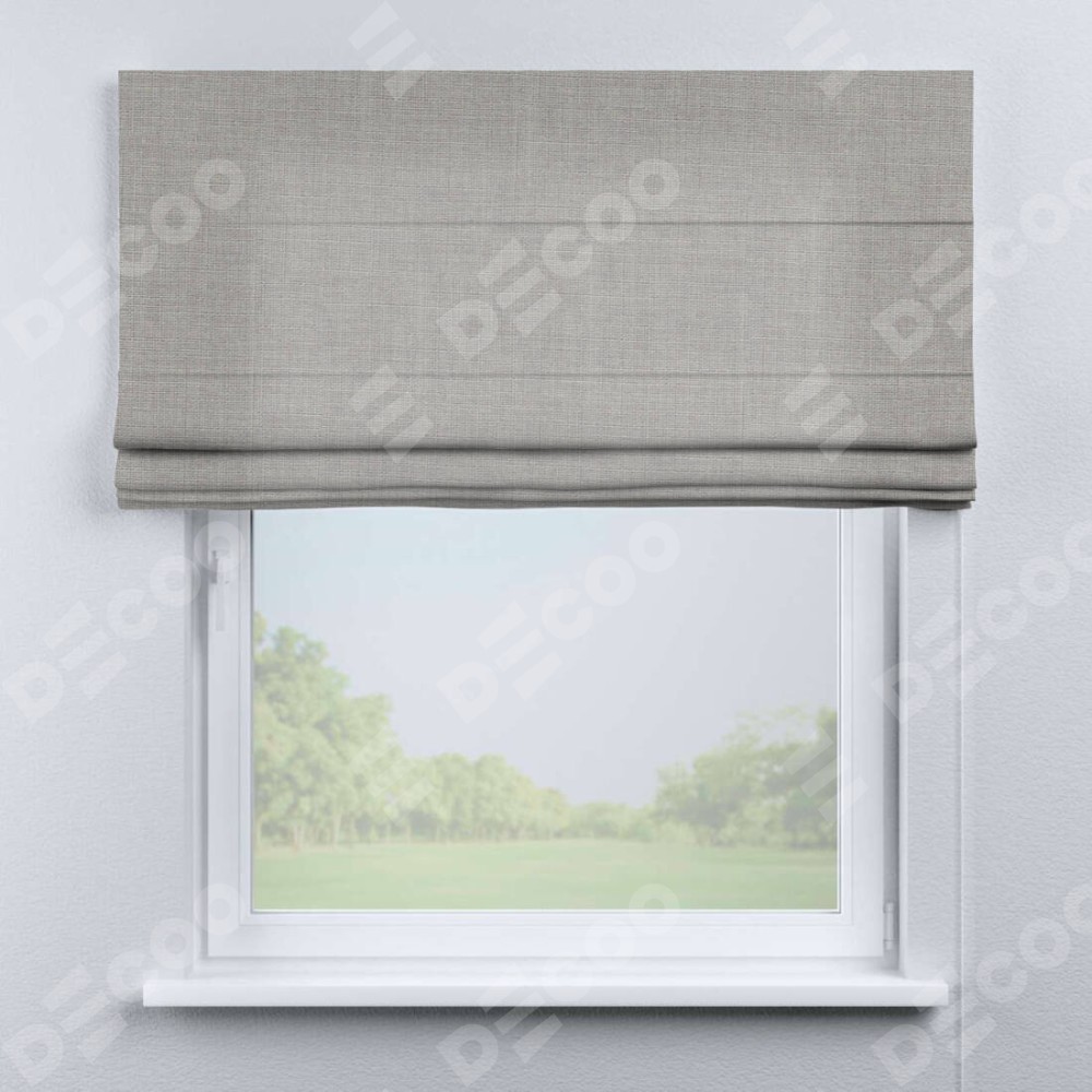 Классическая римская штора производителя «Cortin», пошита из ткани лён серый, артикул: 91410. Имеет универсальный механизм и подходит для монтажа: на потолок, на стену и в нишу.