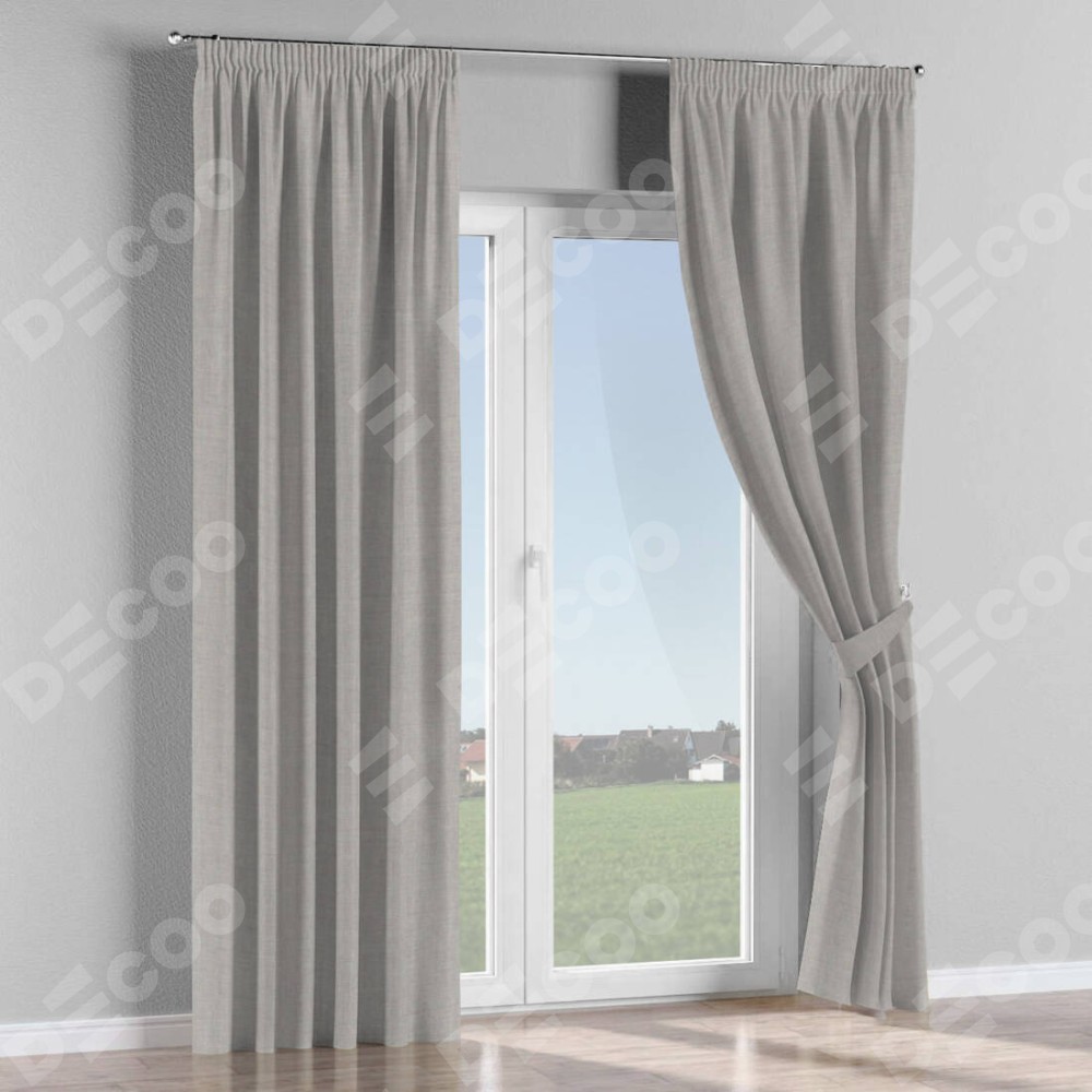 Комплект прямых штор, от производителя «Cortin», пошиты из ткани лён серый, артикул ткани 91410. С изнаночной стороны в верхней части штор пристрачивается шторная лента с декоративными складками «Карандаш». Для создания элегантных складок прямые шторы шьются по стандарту с коэффициентом 1:2 (на 100 см. ширины проёма 200 см. ширины ткани).