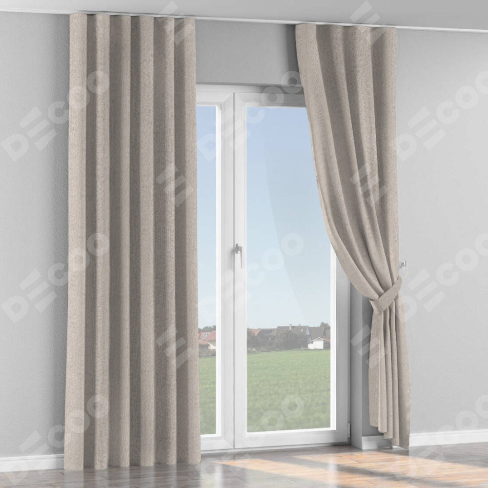 Комплект прямых штор, от производителя «Cortin», пошиты из ткани лён димаут бежевый, артикул ткани 01. С изнаночной стороны в верхней части штор пристрачивается шторная лента с декоративными складками «Волна». Для создания элегантных складок рекомендуемый коэффициент 1:2 (на 100 см. ширины проёма 200 см. ширины ткани). Важно! Ширина штор указана без учёта коэффициента сборки!
