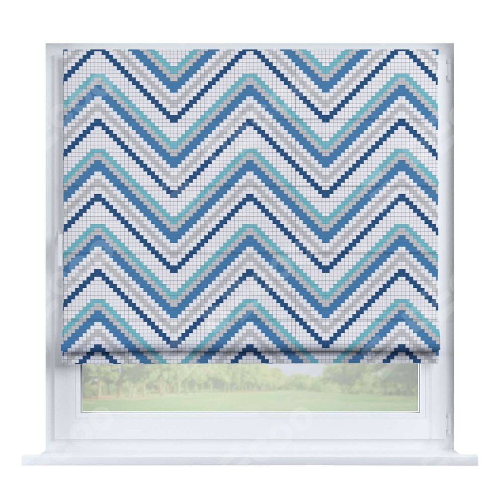 Римская штора производителя «Cortin», устанавливается на створку окна, пошита из ткани блэкаут с нанесением сублимационной печати «Геометрическая волна». Штора шьётся по индивидуальным размерам, для данного типа римской шторы возможная ширина от 35 до 150 см., высота до 250 см.