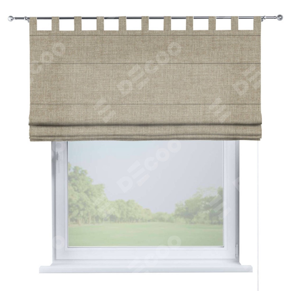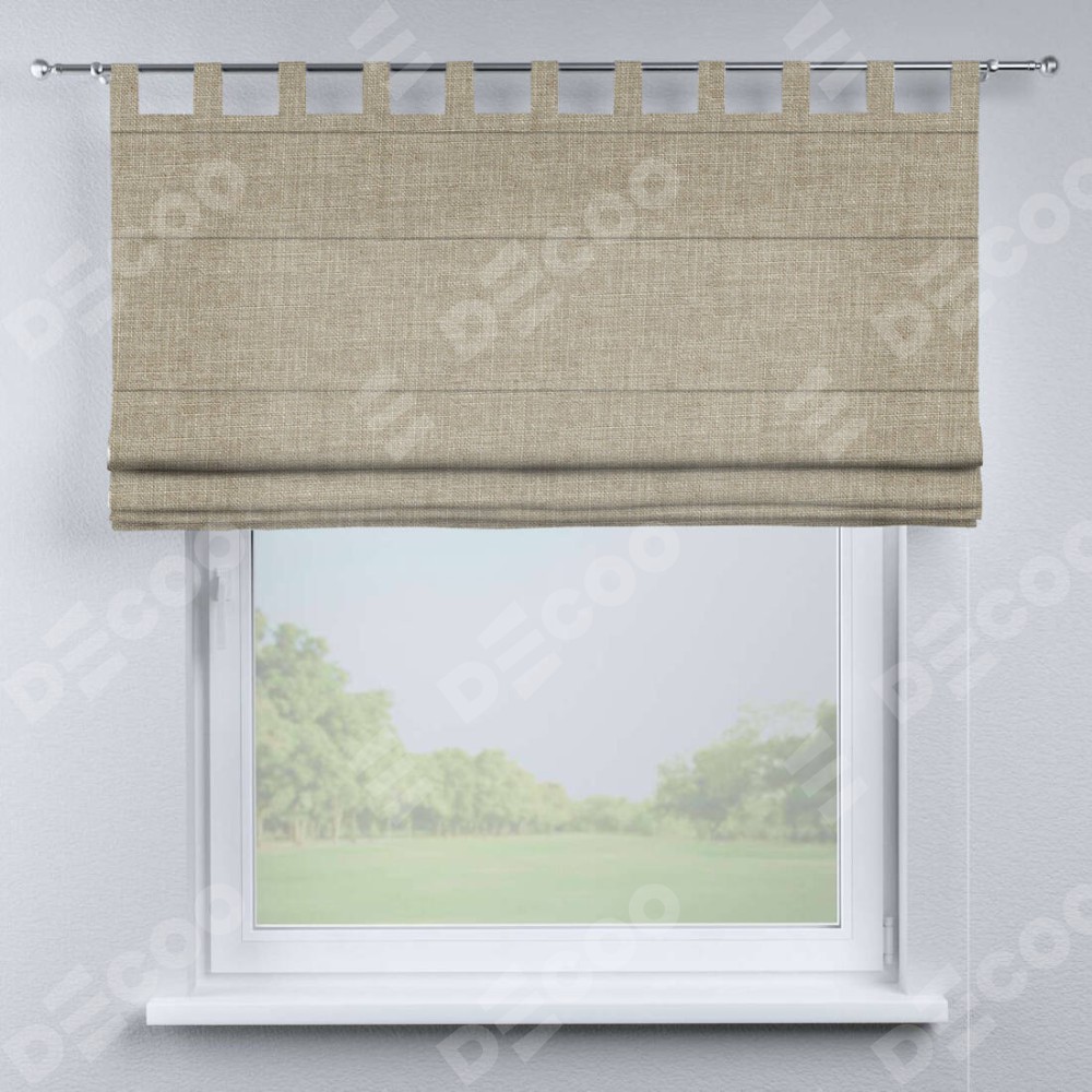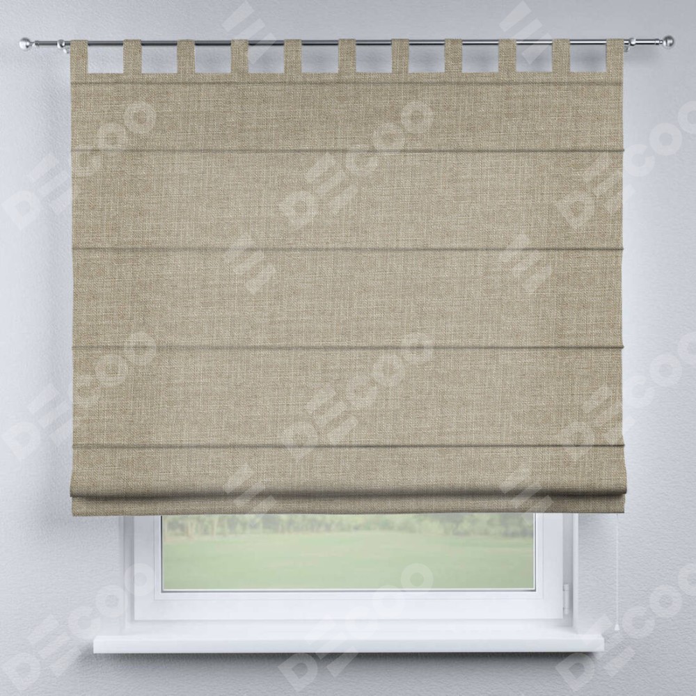 Римская штора производителя «Cortin», используется для проёма, пошита из ткани лён бежевый, артикул ткани 143839. Данная модель пошита на петлях, комплектуется на выбор круглым карнизом и подходит для монтажа на стену. Римская штора на петлях имеет простую систему регулировки высоты, отличительным преимуществом данной модели является простой способ монтажа. Достаточно повесить ее на трубу и штора готова!