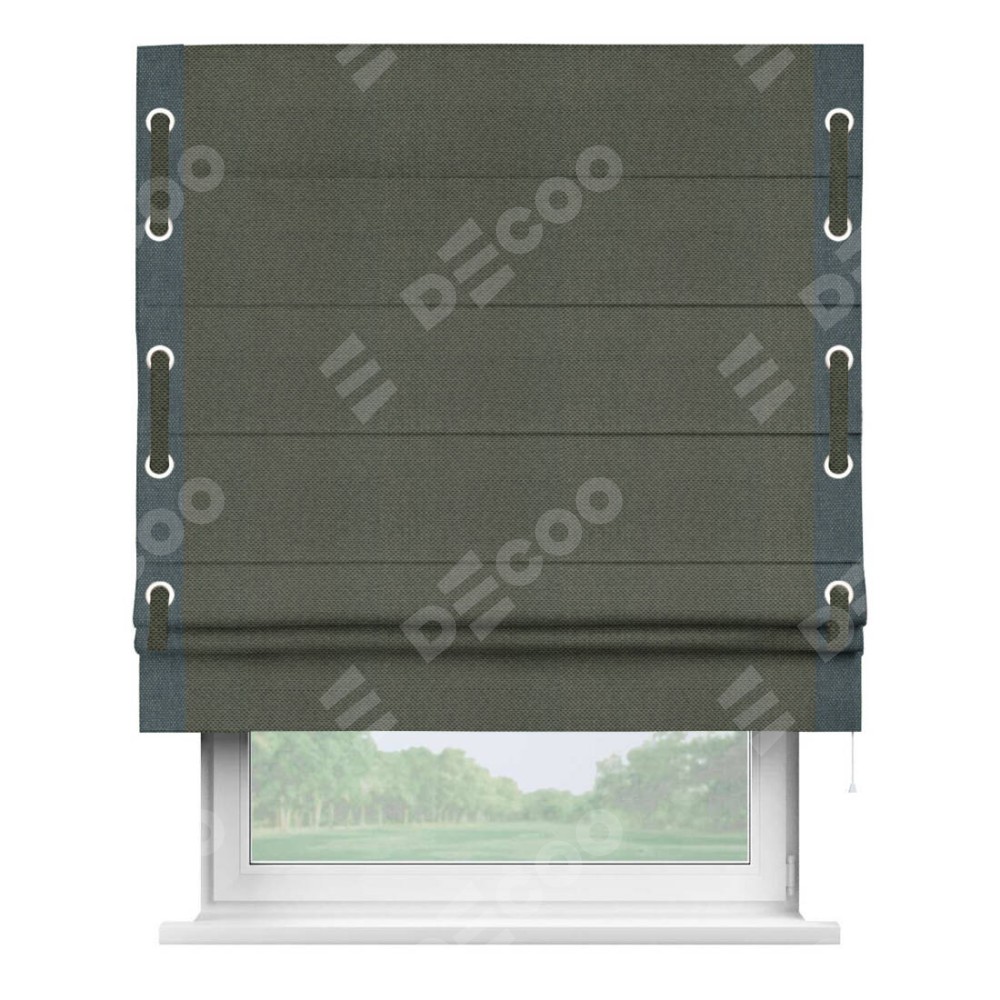 Римская штора производителя «Cortin», используется для проёма, пошита из ткани лён димаут графит, артикул 27. Отделка шторы кантом «Стрим Дуо» на кантах расположены люверсы с пояском, ткань для канта используется лён димаут разной расцветки на выбор. Ткань для пояска обычно используется из основной ткани шторы, а так же можно сделать из любой расцветки по желанию. Имеет универсальный механизм и подходит для монтажа: на потолок, на стену и в нишу.