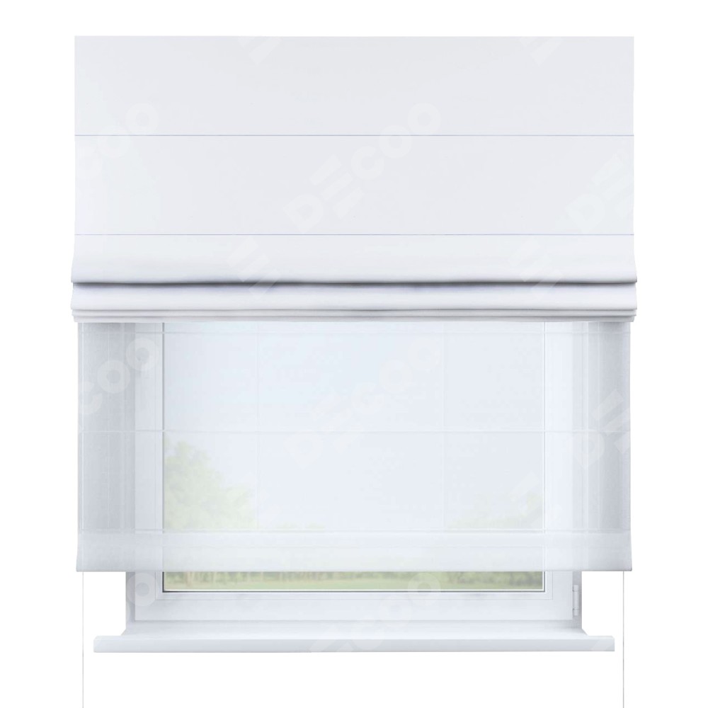 Двойная римская штора «День-ночь» от производителя Cortin предназначена для использования в проёмах. Эта штора уникальна тем, что состоит из двух полотен. На лицевой стороне находится вайтаут однотонная белая (артикул: 93935), обеспечивающий эффективное затемнение. В комплект также входит вторая ткань — легкий белый тюль (артикул: V-01), который добавляет изящества и легкости оформлению окна. Кроме того, доступны и другие разновидности ткани тюль, выбор которых доступен по  ссылке .