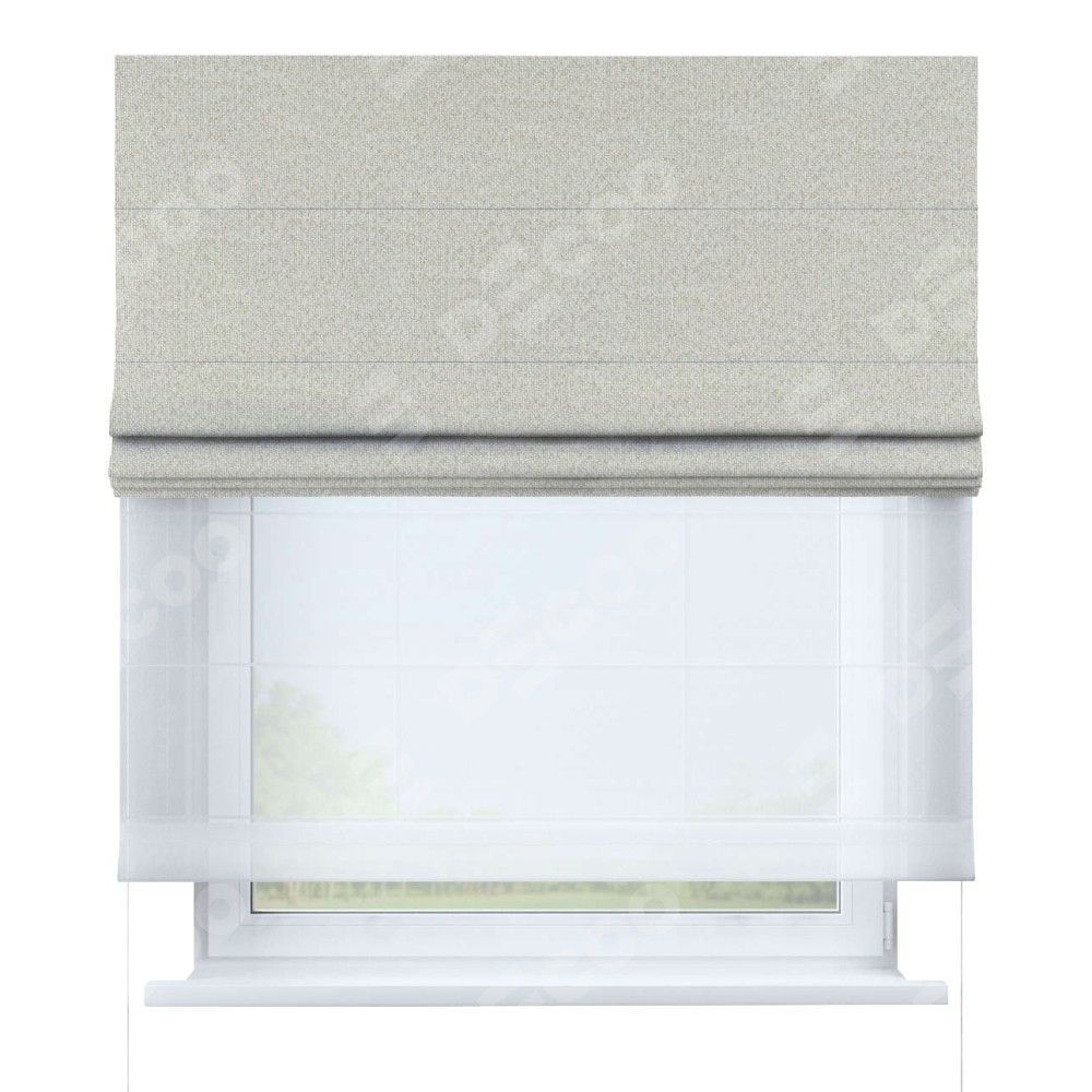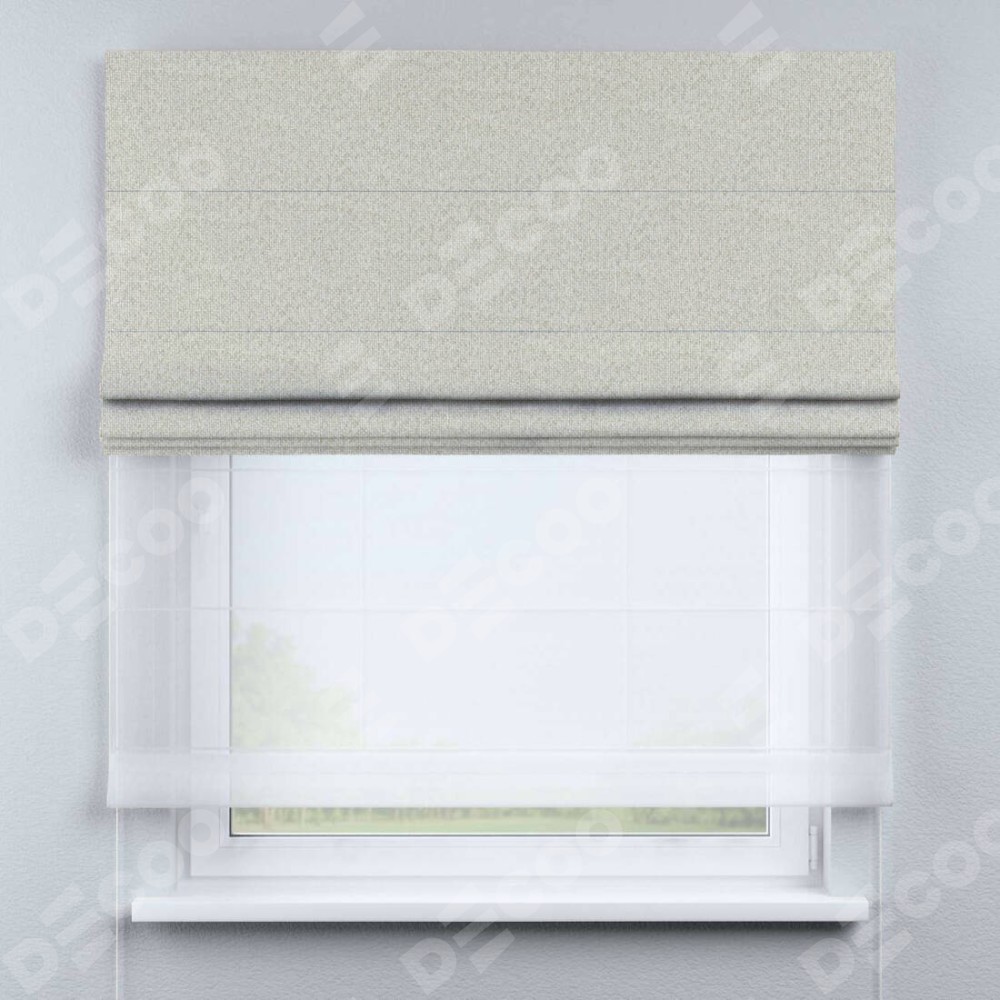 Двойная римская штора «День-ночь» от производителя Cortin предназначена для использования в проёмах. Эта штора уникальна тем, что состоит из двух полотен. На лицевой стороне находится лён димаут светло-бежевый (артикул: 140649), обеспечивающий эффективное затемнение. В комплект также входит вторая ткань — легкий белый тюль (артикул: V-01), который добавляет изящества и легкости оформлению окна. Кроме того, доступны и другие разновидности ткани тюль, выбор которых доступен по  ссылке .