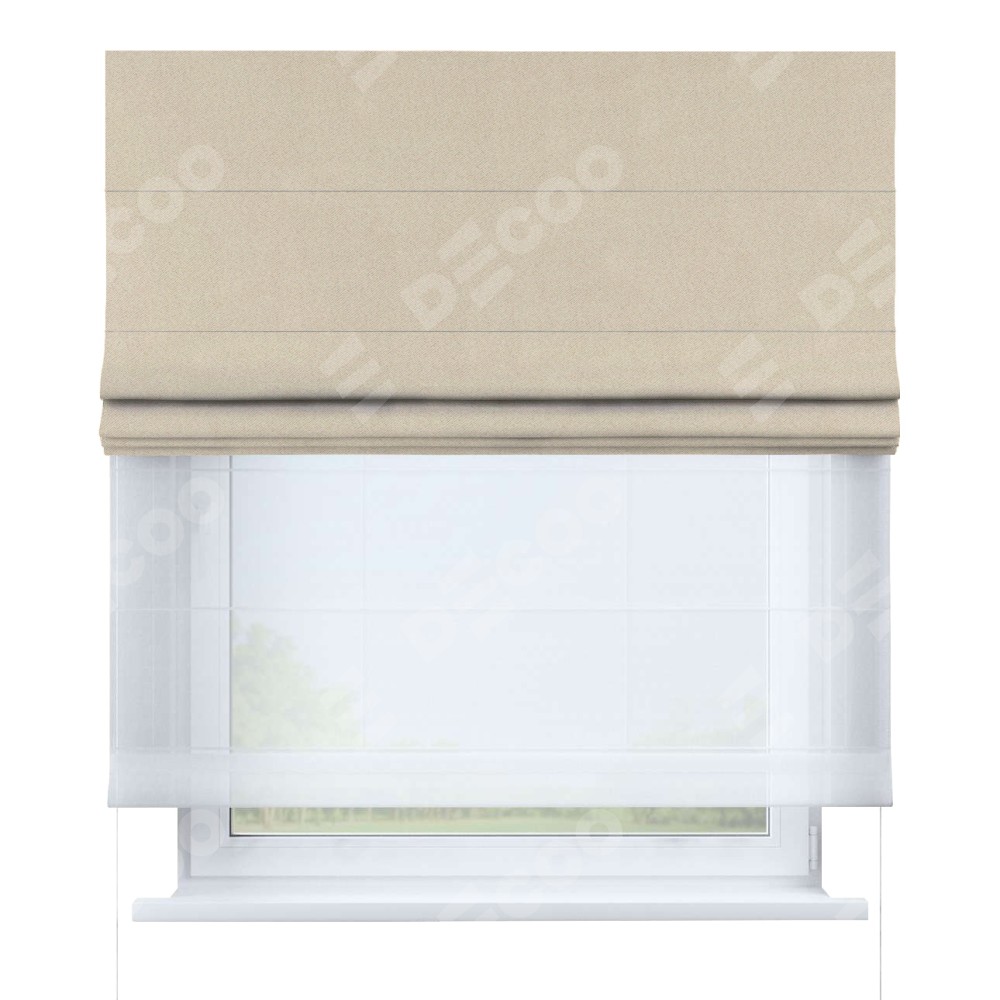 Двойная римская штора «День-ночь» от производителя Cortin предназначена для использования в проёмах. Эта штора уникальна тем, что состоит из двух полотен. На лицевой стороне находится однотонный блэкаут кофейно-бежевый (артикул: 91566−1), обеспечивающий эффективное затемнение. В комплект также входит вторая ткань — легкий белый тюль (артикул: V-01), который добавляет изящества и легкости оформлению окна. Кроме того, доступны и другие разновидности ткани тюль, выбор которых доступен по  ссылке .