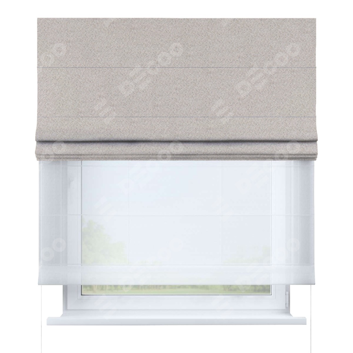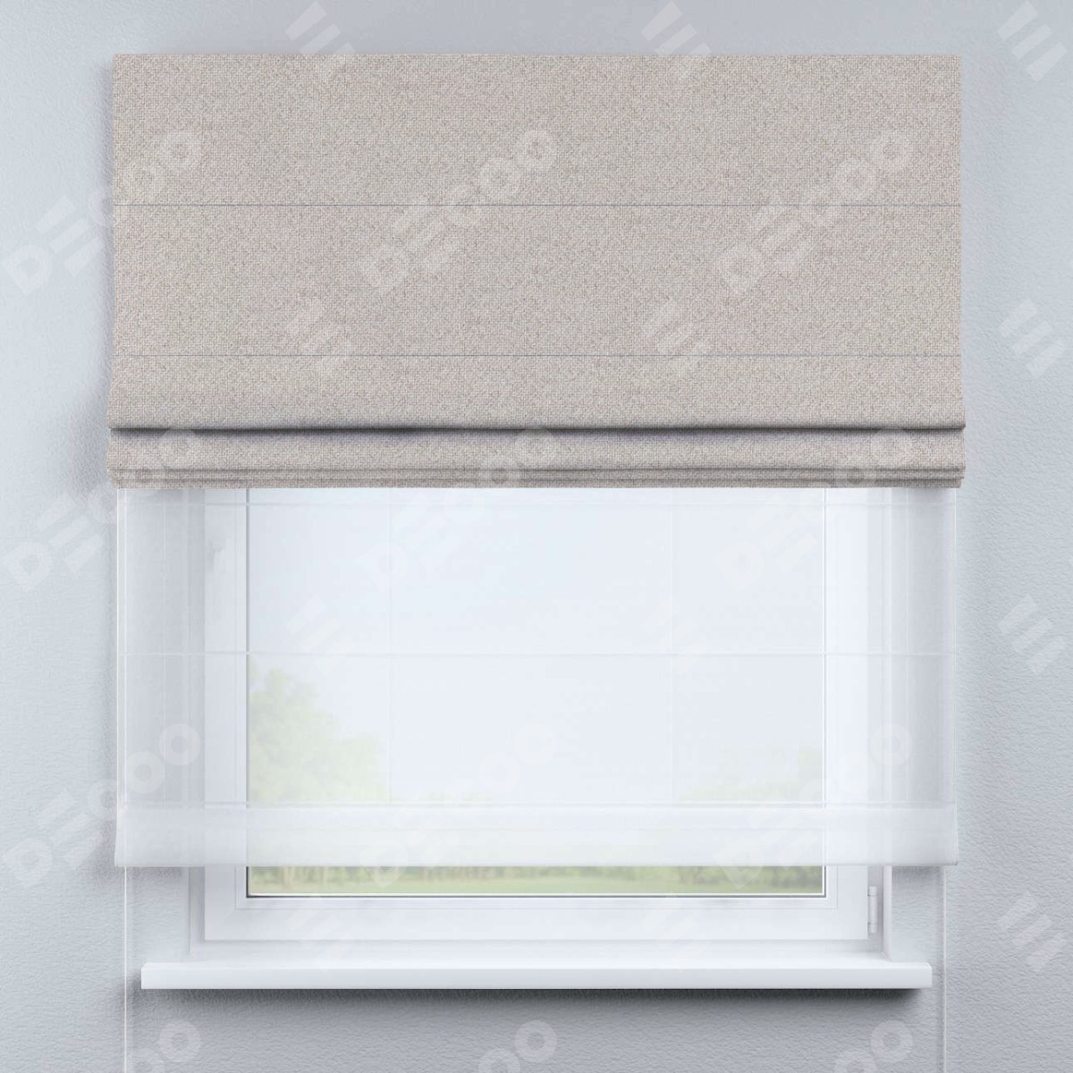 Двойная римская штора «День-ночь» от производителя Cortin предназначена для использования в проёмах. Эта штора уникальна тем, что состоит из двух полотен. На лицевой стороне находится лён димаут бежевый (артикул: 01), обеспечивающий эффективное затемнение. В комплект также входит вторая ткань — легкий белый тюль (артикул: V-01), который добавляет изящества и легкости оформлению окна. Кроме того, доступны и другие разновидности ткани тюль, выбор которых доступен по ссылке .