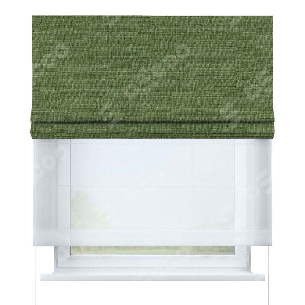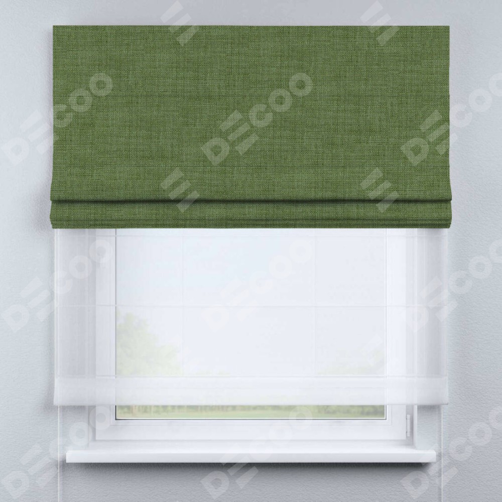 Двойная римская штора «День-ночь» от производителя Cortin предназначена для использования в проёмах. Эта штора уникальна тем, что состоит из двух полотен. На лицевой стороне находится лён зелёный (артикул: 131547), обеспечивающий эффективное затемнение. В комплект также входит вторая ткань — легкий белый тюль (артикул: V-01), который добавляет изящества и легкости оформлению окна. Кроме того, доступны и другие разновидности ткани тюль, выбор которых доступен по ссылке .
