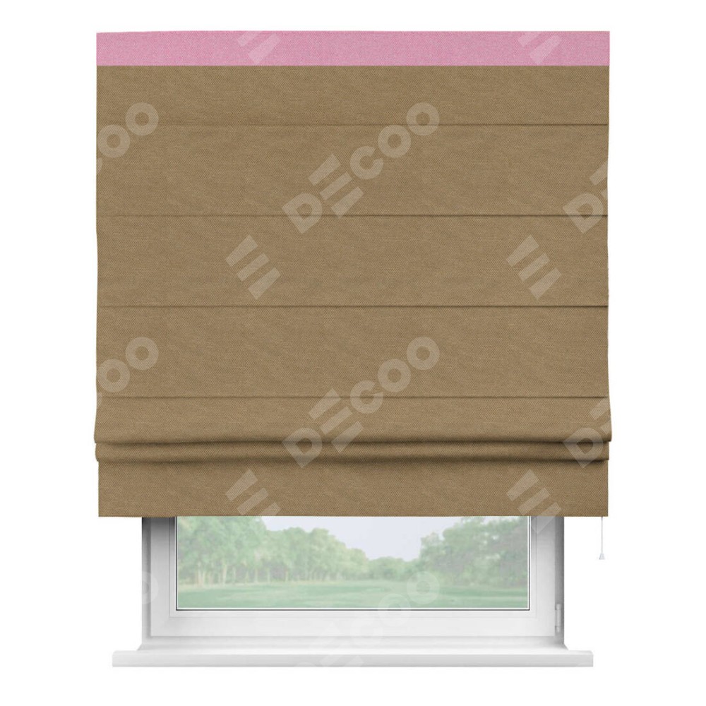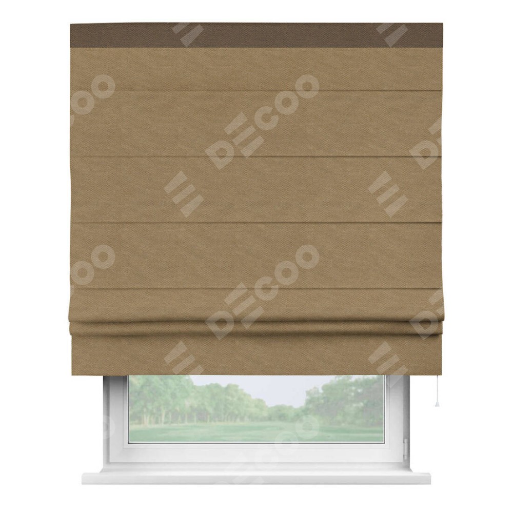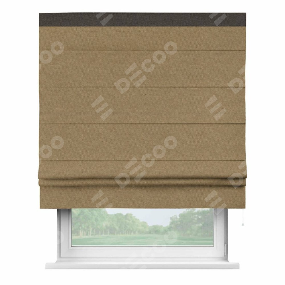 Римская штора производителя «Cortin», используется для проёма, пошита из ткани лён димаут Коричневый, артикул 83026. Отделка шторы кантом «Кинг», ткань для канта используется из льна димаут разной расцветки на выбор. Имеет универсальный механизм и подходит для монтажа: на потолок, на стену и в нишу.