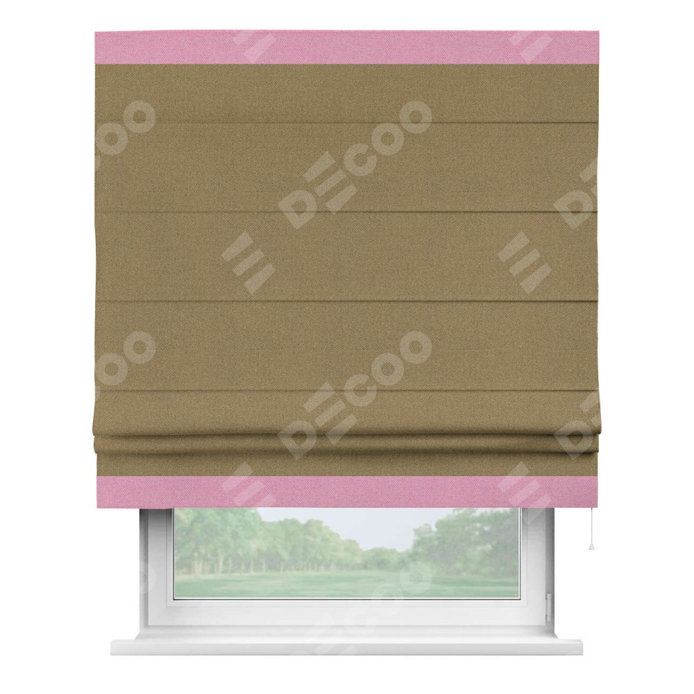 Римская штора производителя «Cortin», используется для проёма, пошита из ткани лён димаут оливковый, артикул 16243. Отделка шторы кантом «Горизонт», ткань для канта используется из льна димаут разной расцветки на выбор. Имеет универсальный механизм и подходит для монтажа: на потолок, на стену и в нишу.