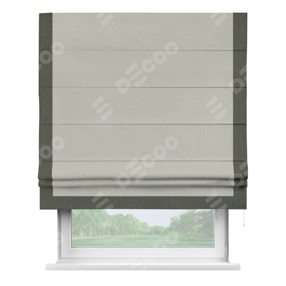 Римская штора производителя «Cortin», используется для проёма, пошита из ткани лён димаут светло-серый, артикул 83025. Отделка шторы кантом «Виктория», ткань для канта используется из льна димаут разной расцветки на выбор. Имеет универсальный механизм и подходит для монтажа: на потолок, на стену и в нишу.