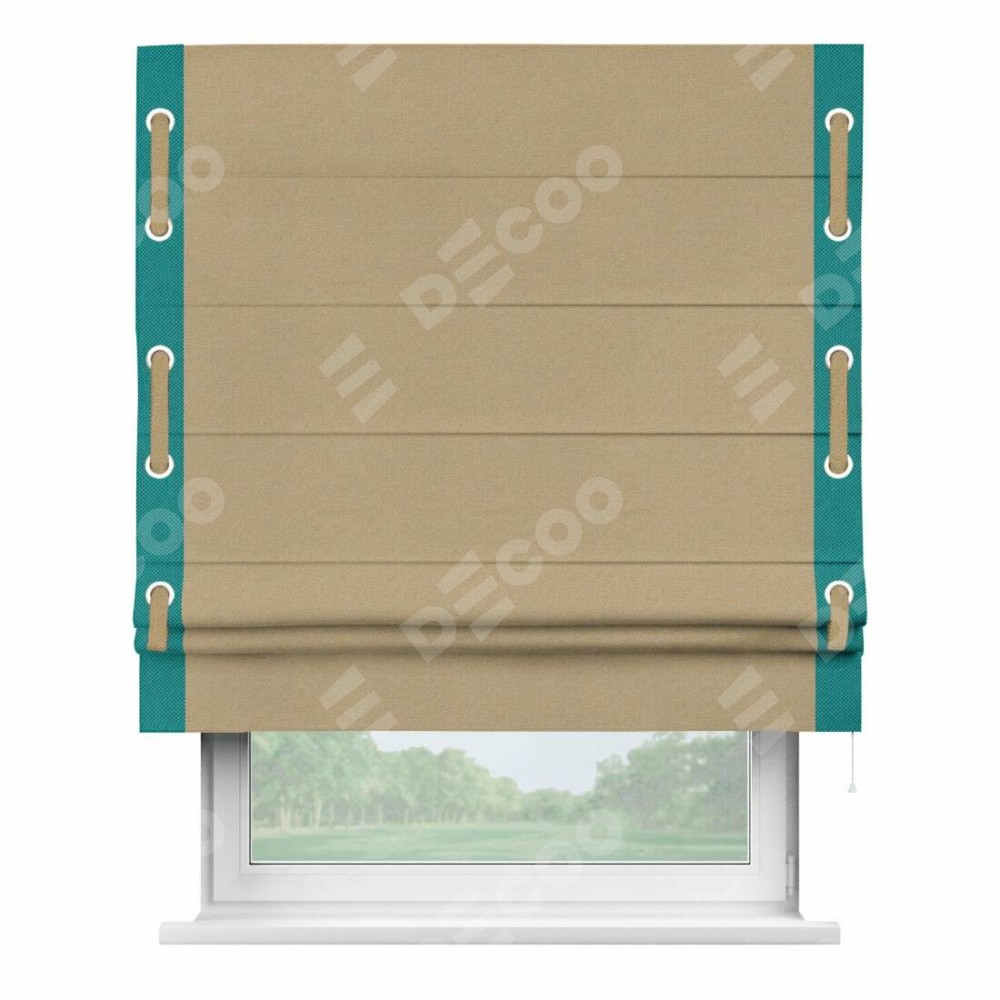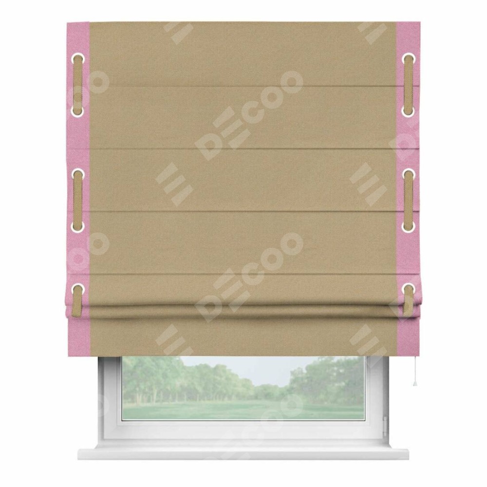 Римская штора производителя «Cortin», используется для проёма, пошита из ткани лён димаут тёмно-бежевый, артикул 83037. Отделка шторы кантом «Стрим Дуо» на кантах расположены люверсы с пояском, ткань для канта используется лён димаут разной расцветки на выбор. Ткань для пояска обычно используется из основной ткани шторы, а так же можно сделать из любой расцветки по желанию. Имеет универсальный механизм и подходит для монтажа: на потолок, на стену и в нишу.