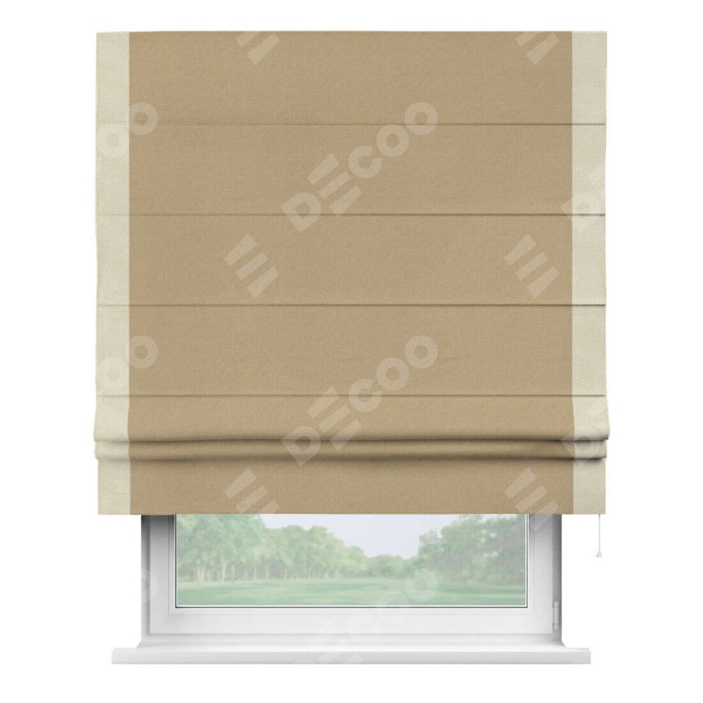 Римская штора производителя «Cortin», используется для проёма, пошита из ткани лён димаут тёмно-бежевый, артикул 83037. Отделка шторы кантом «Стрим Дуо», ткань для канта используется из льна димаут разной расцветки на выбор. Имеет универсальный механизм и подходит для монтажа: на потолок, на стену и в нишу.