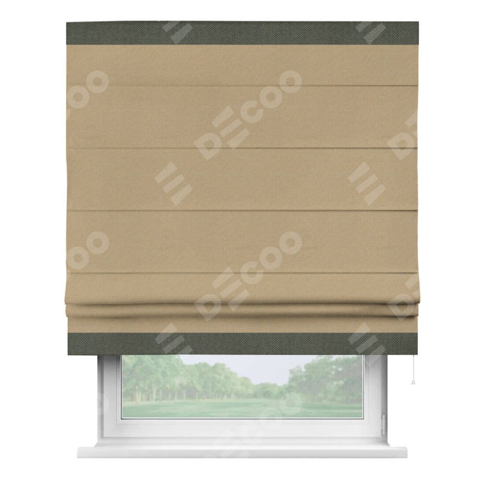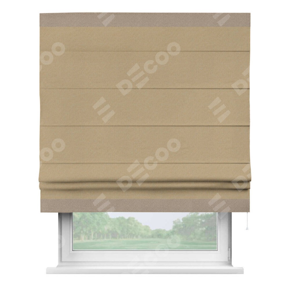 Римская штора производителя «Cortin», используется для проёма, пошита из ткани лён димаут тёмно-бежевый, артикул 83037. Отделка шторы кантом «Горизонт», ткань для канта используется из льна димаут разной расцветки на выбор. Имеет универсальный механизм и подходит для монтажа: на потолок, на стену и в нишу.