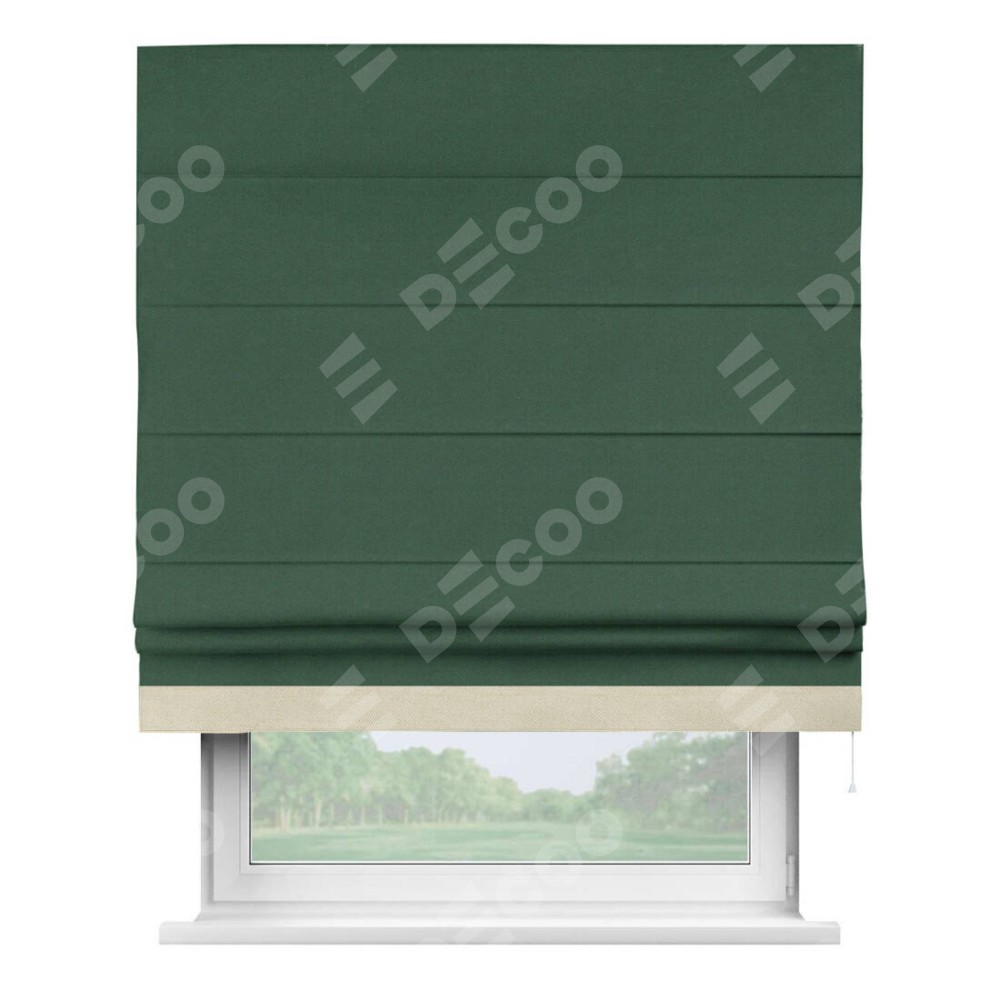 Римская штора производителя «Cortin», используется для проёма, пошита из ткани лён димаут тёмно-зелёный, артикул 16246. Отделка шторы кантом «Джестер», ткань для канта используется из льна димаут разной расцветки на выбор. Имеет универсальный механизм и подходит для монтажа: на потолок, на стену и в нишу.