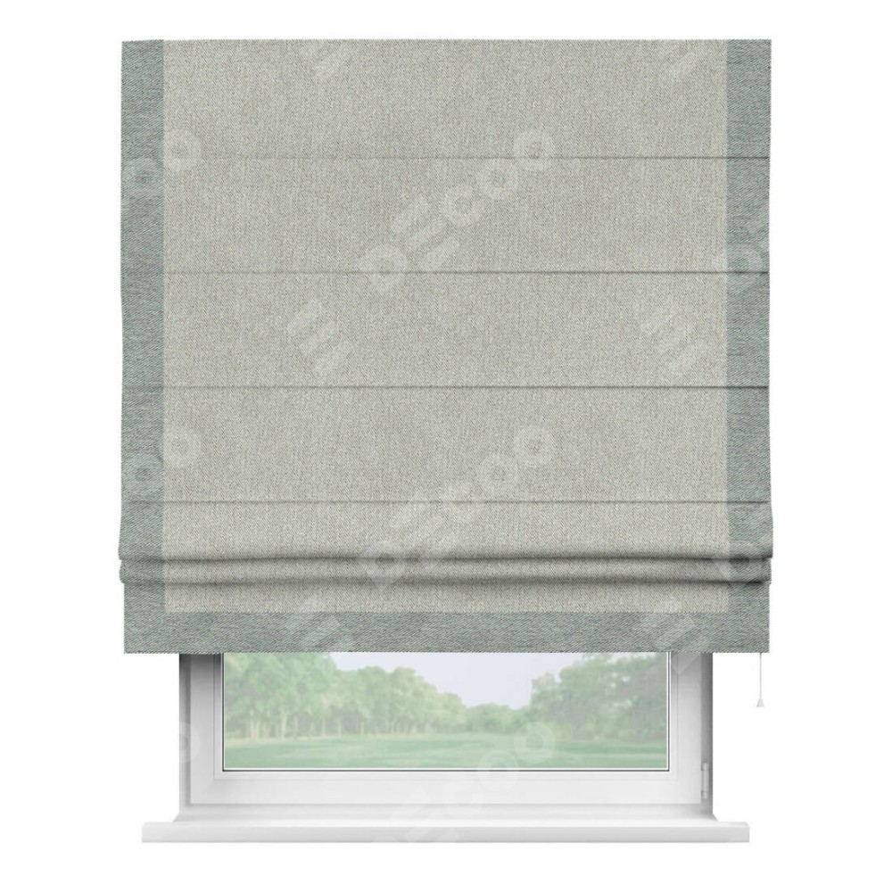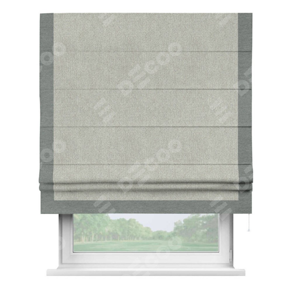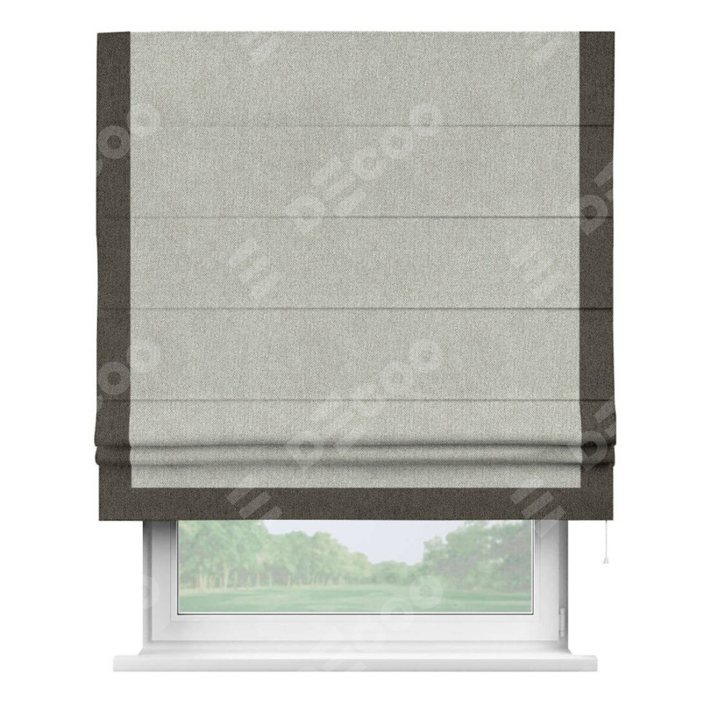 Римская штора производителя «Cortin», используется для проёма, пошита из ткани твид блэкаут коричнево-серый, артикул 21574. Отделка шторы кантом «Виктория», ткань для канта используется из твида разной расцветки на выбор. Имеет универсальный механизм и подходит для монтажа: на потолок, на стену и в нишу.