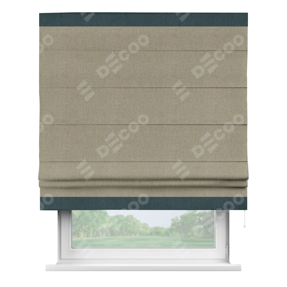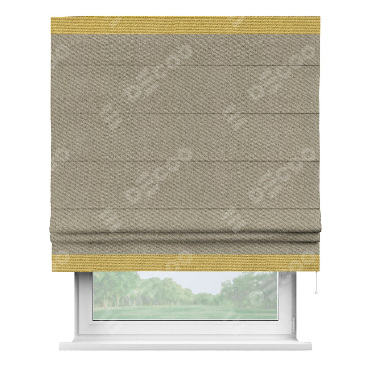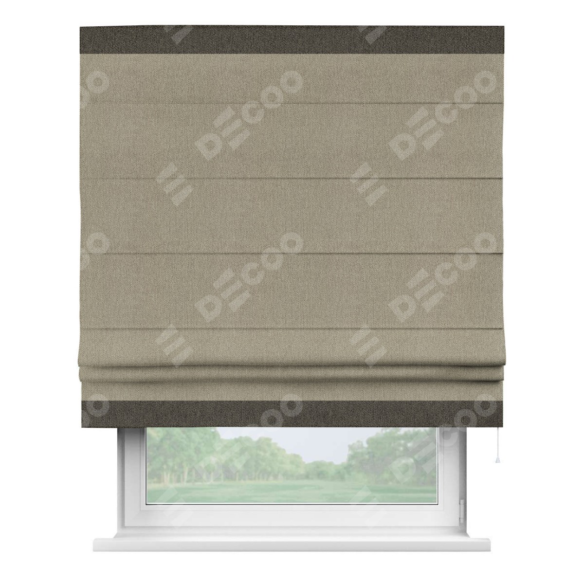 Римская штора производителя «Cortin», используется для проёма, пошита из ткани твид блэкаут кофе, артикул 21575. Отделка шторы кантом «Горизонт», ткань для канта используется из твида разной расцветки на выбор. Имеет универсальный механизм и подходит для монтажа: на потолок, на стену и в нишу.