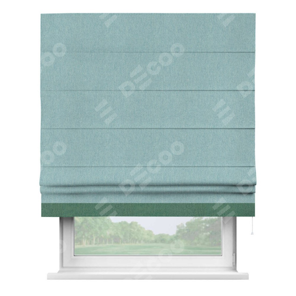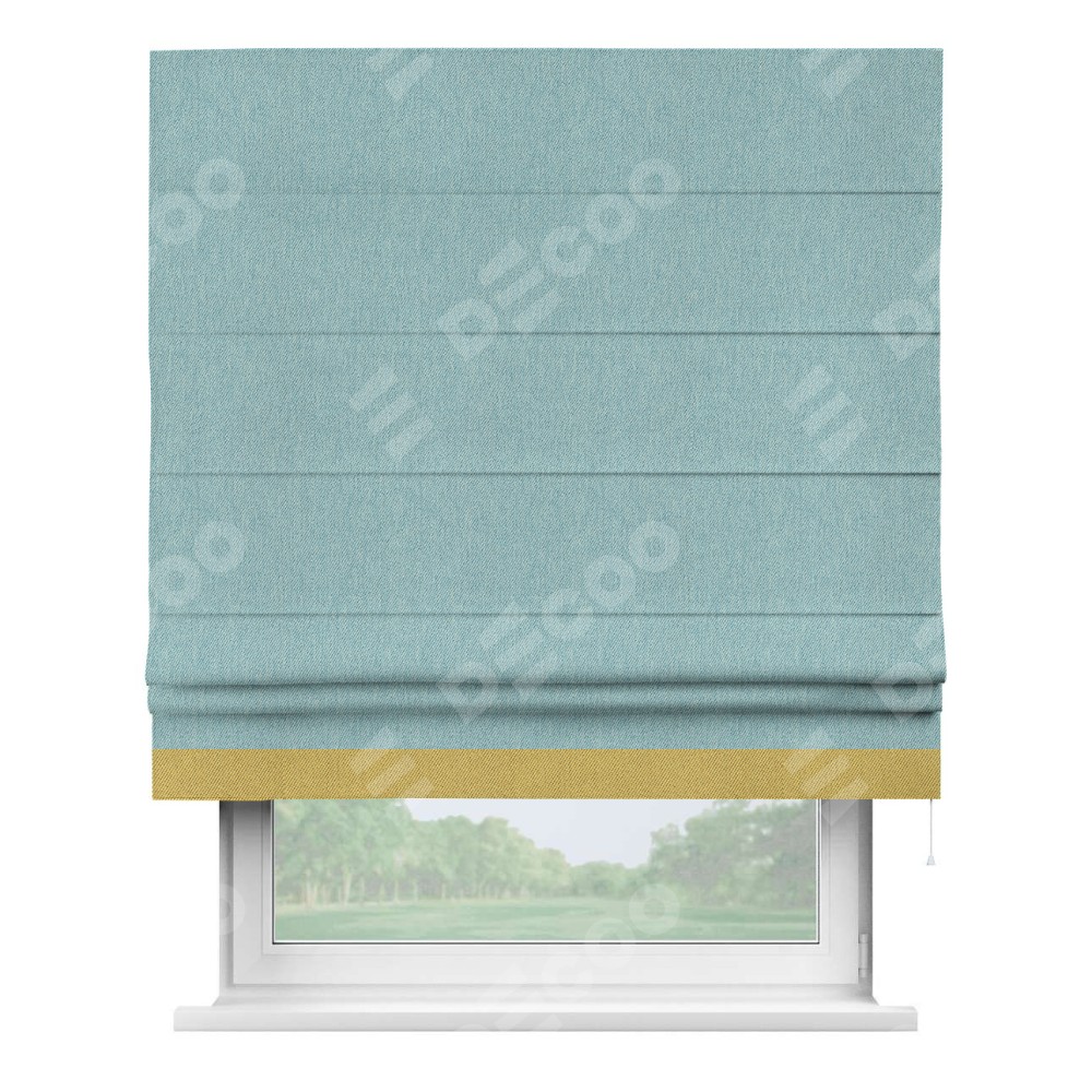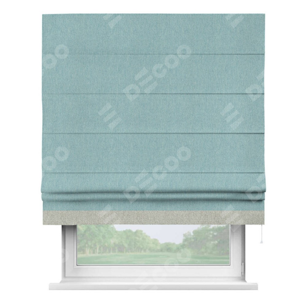 Римская штора производителя «Cortin», используется для проёма, пошита из ткани твид блэкаут небесно-голубой, артикул 21578. Отделка шторы кантом «Джестер», ткань для канта используется из твида разной расцветки на выбор. Имеет универсальный механизм и подходит для монтажа: на потолок, на стену и в нишу.