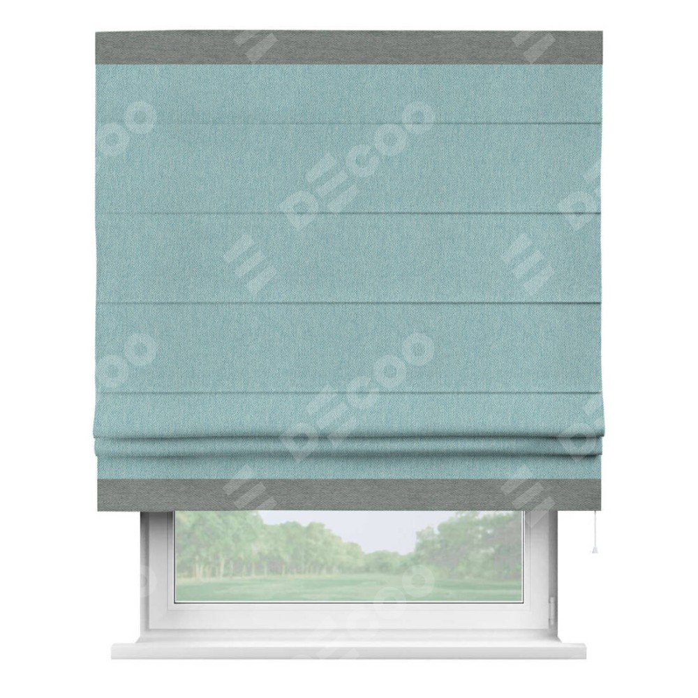 Римская штора производителя «Cortin», используется для проёма, пошита из ткани твид блэкаут небесно-голубой, артикул 21578. Отделка шторы кантом «Горизонт», ткань для канта используется из твида разной расцветки на выбор. Имеет универсальный механизм и подходит для монтажа: на потолок, на стену и в нишу.