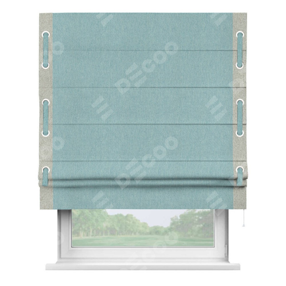 Римская штора производителя «Cortin», используется для проёма, пошита из ткани твид блэкаут небесно-голубой, артикул 21578. Отделка шторы кантом «Кинг», ткань для канта используется из твида разной расцветки на выбор. Имеет универсальный механизм и подходит для монтажа: на потолок, на стену и в нишу.
