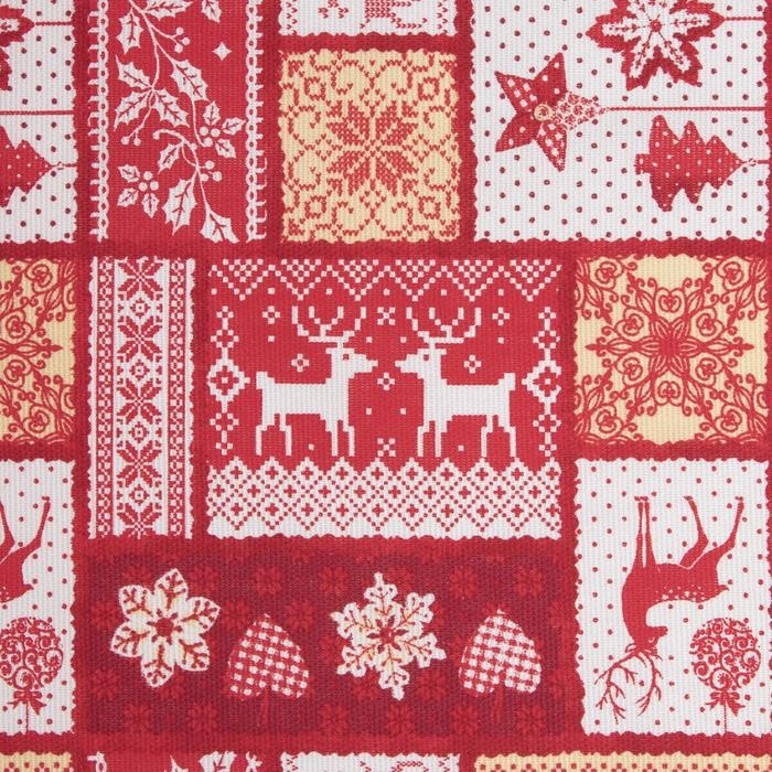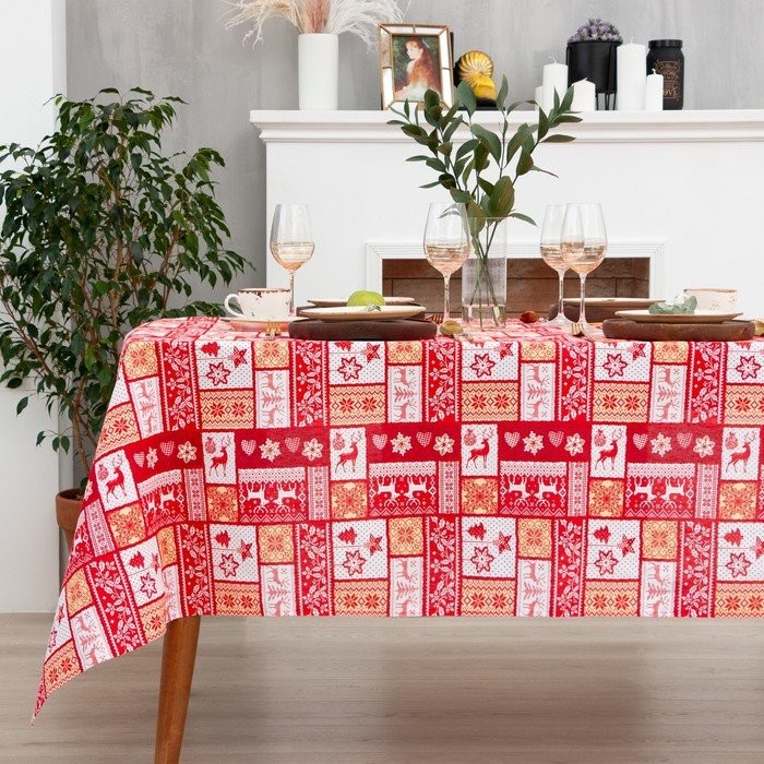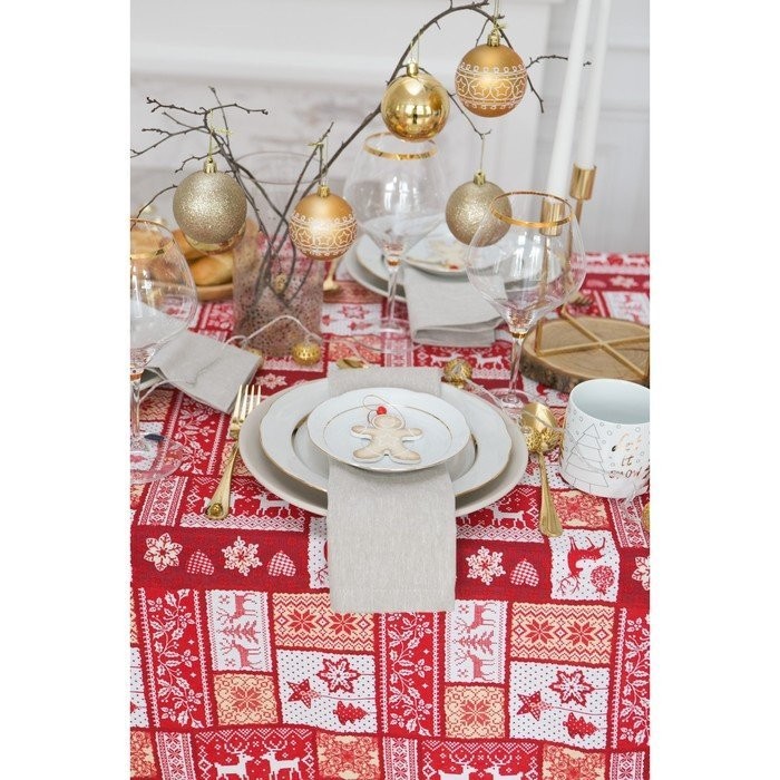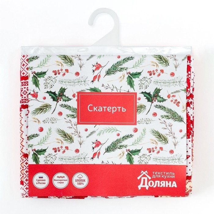 Скатерть от торговой марки «„Доляна“» украсит праздничный интерьер. Изделия с эксклюзивным принтом сшито из хлопкового полотна. Этот материал имеет плотную и упругую структуру, обладает высокой прочностью и на ура справляется с первостепенными задачами:
