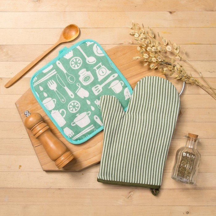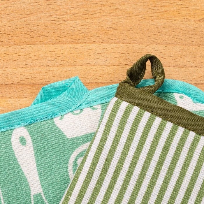 Набор Доляна, варежка+прихватка Зеленая полоска/Кухня, 100%пэ, рогожка 200 гр/м