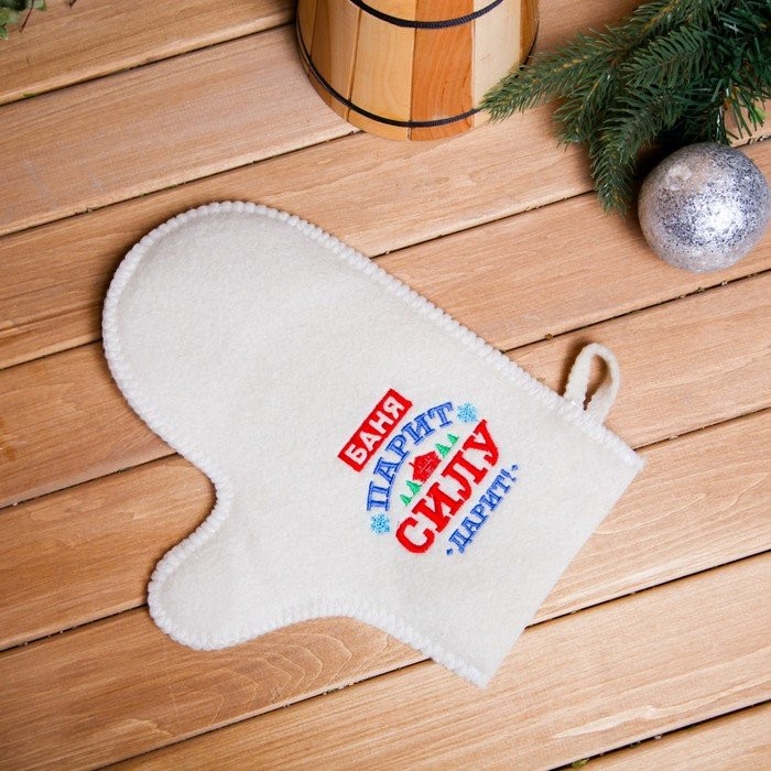 Рукавица для бани с вышивкой «Баня парит, силу дарит, с домиком»