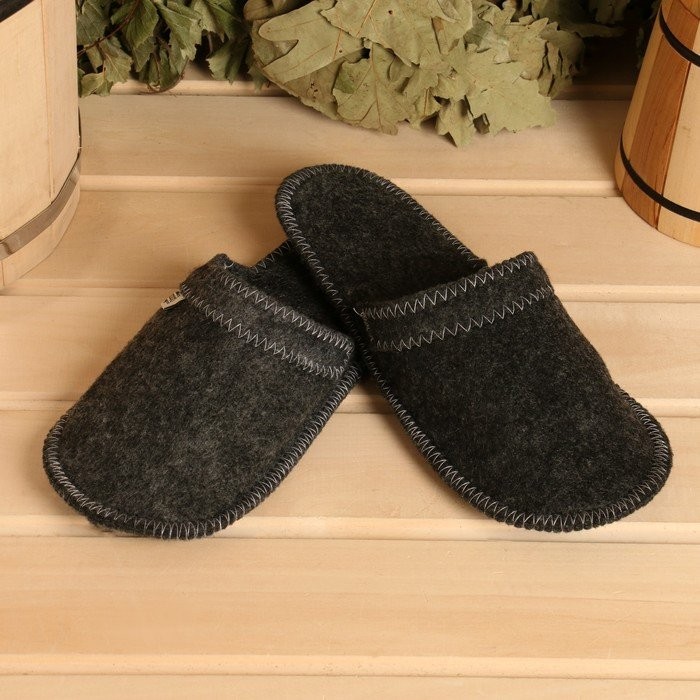 Тапочки из войлока и коврик впитывают влагу и сохраняют сухость, что обеспечивает комфорт во время посещения парной.